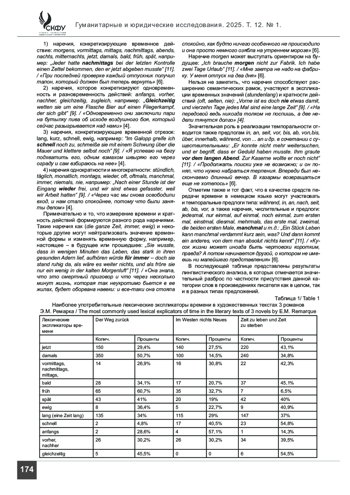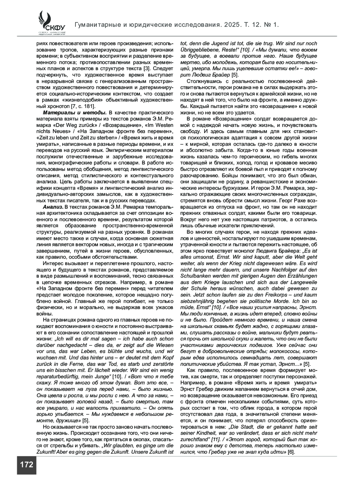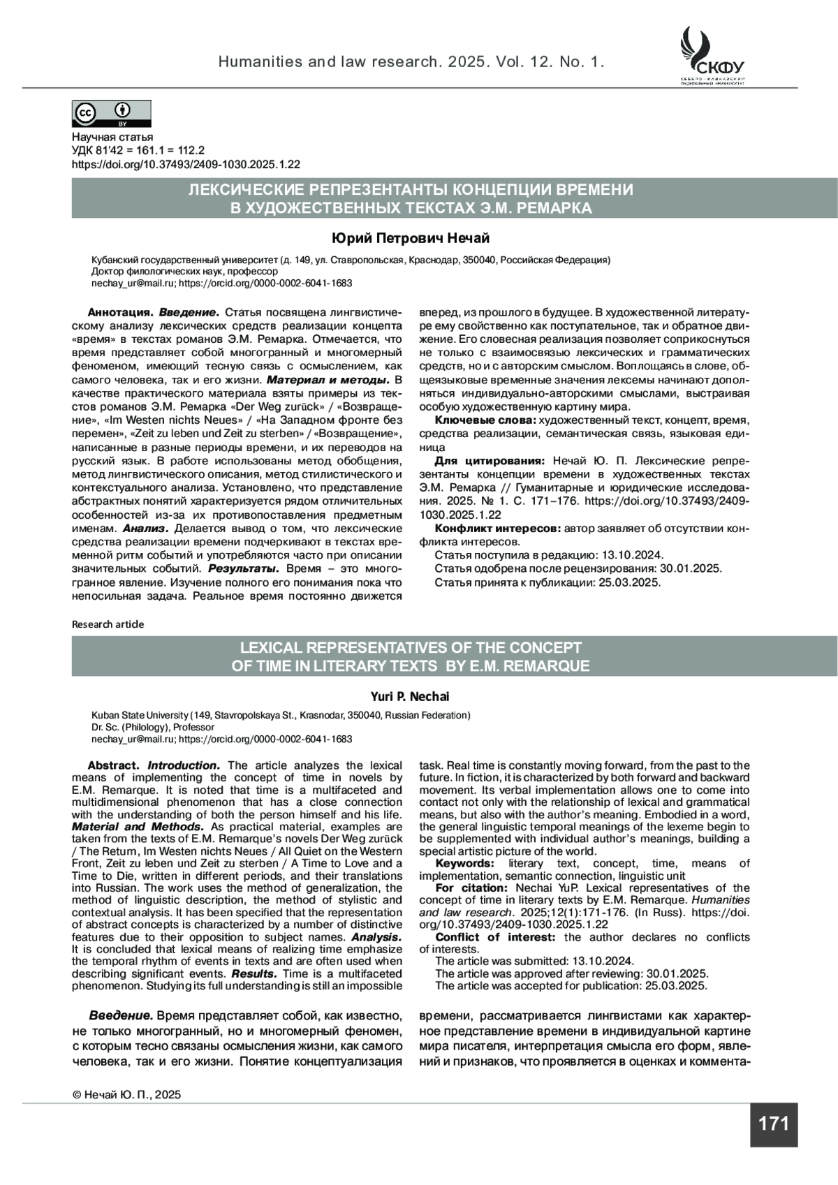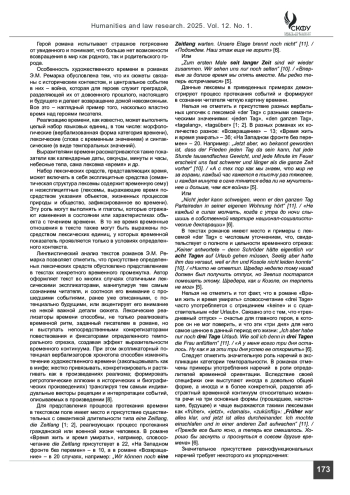 Введение. Статья посвящена лингвистическому анализу лексических средств реализации концепта «время» в текстах романов Э. М. Ремарка. Отмечается, что время представляет собой многогранный и многомерный феноменом, имеющий тесную связь с осмыслением, как самого человека, так и его жизни.