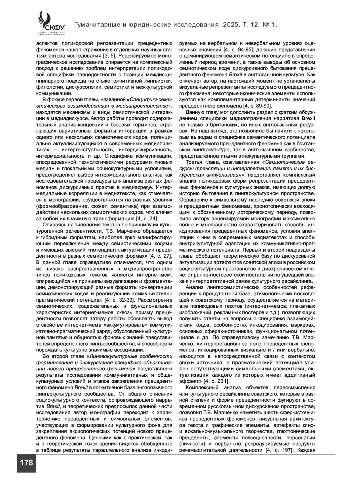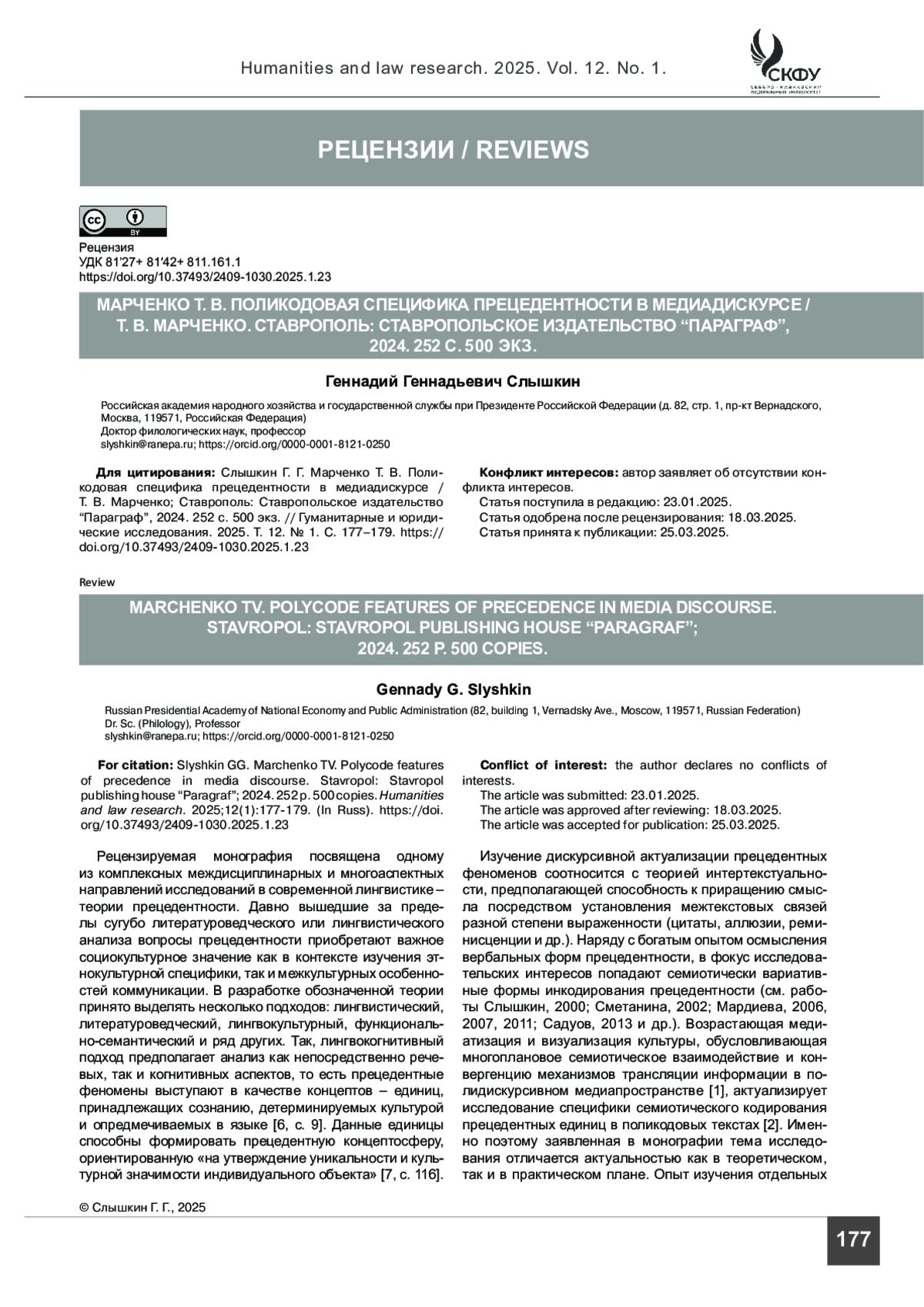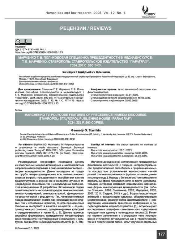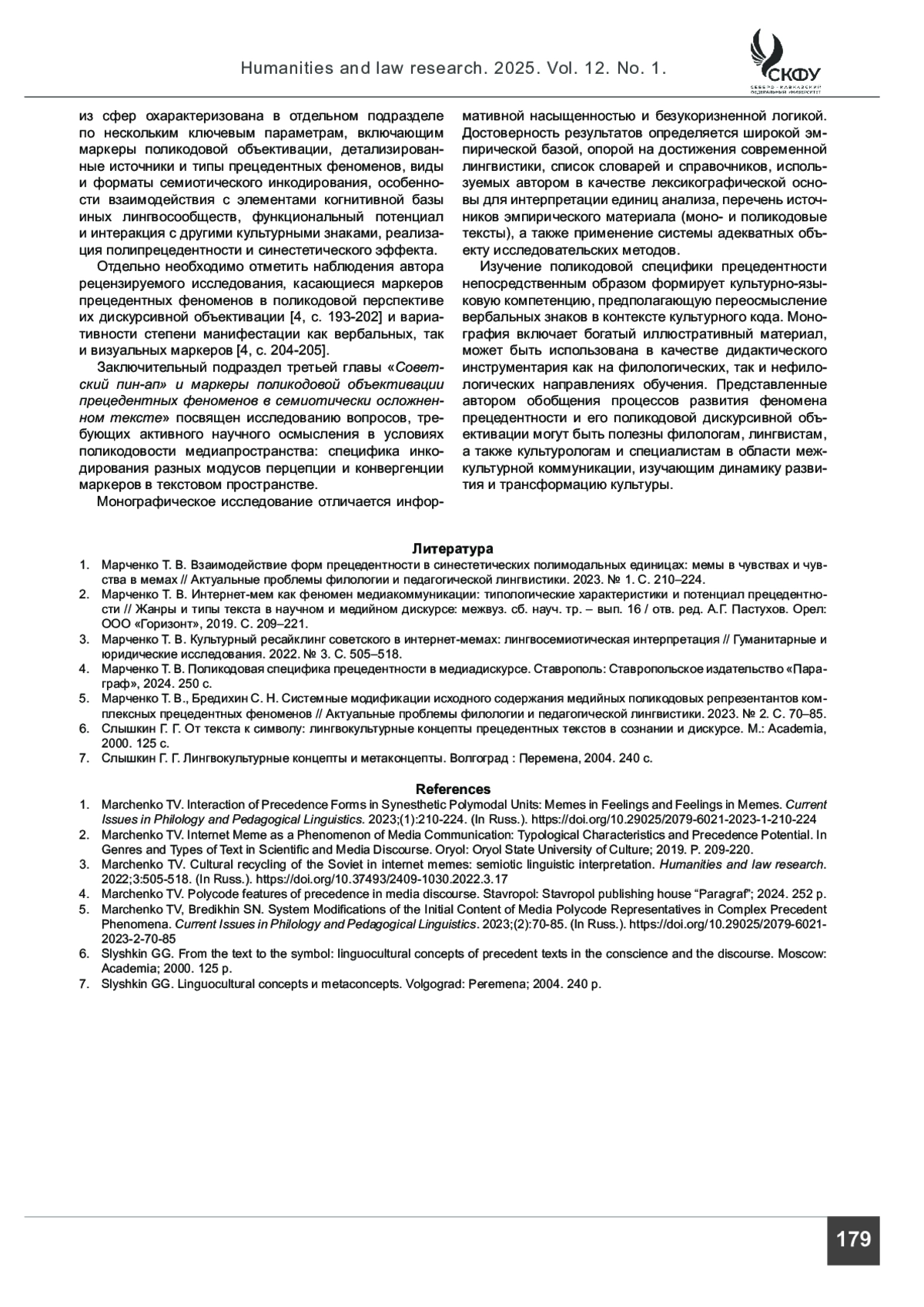 Для цитирования: Слышкин Г. Г. Марченко Т. В. Поликодовая специфика прецедентности в медиадискурсе / Т. В. Марченко; Ставрополь: Ставропольское издательство “Параграф”, 2024. 252 с. 500 экз. Гуманитарные и юридические исследования. 2025;12(1):177-179. https://doi. org/10.37493/2409-1030.2025.1.23
