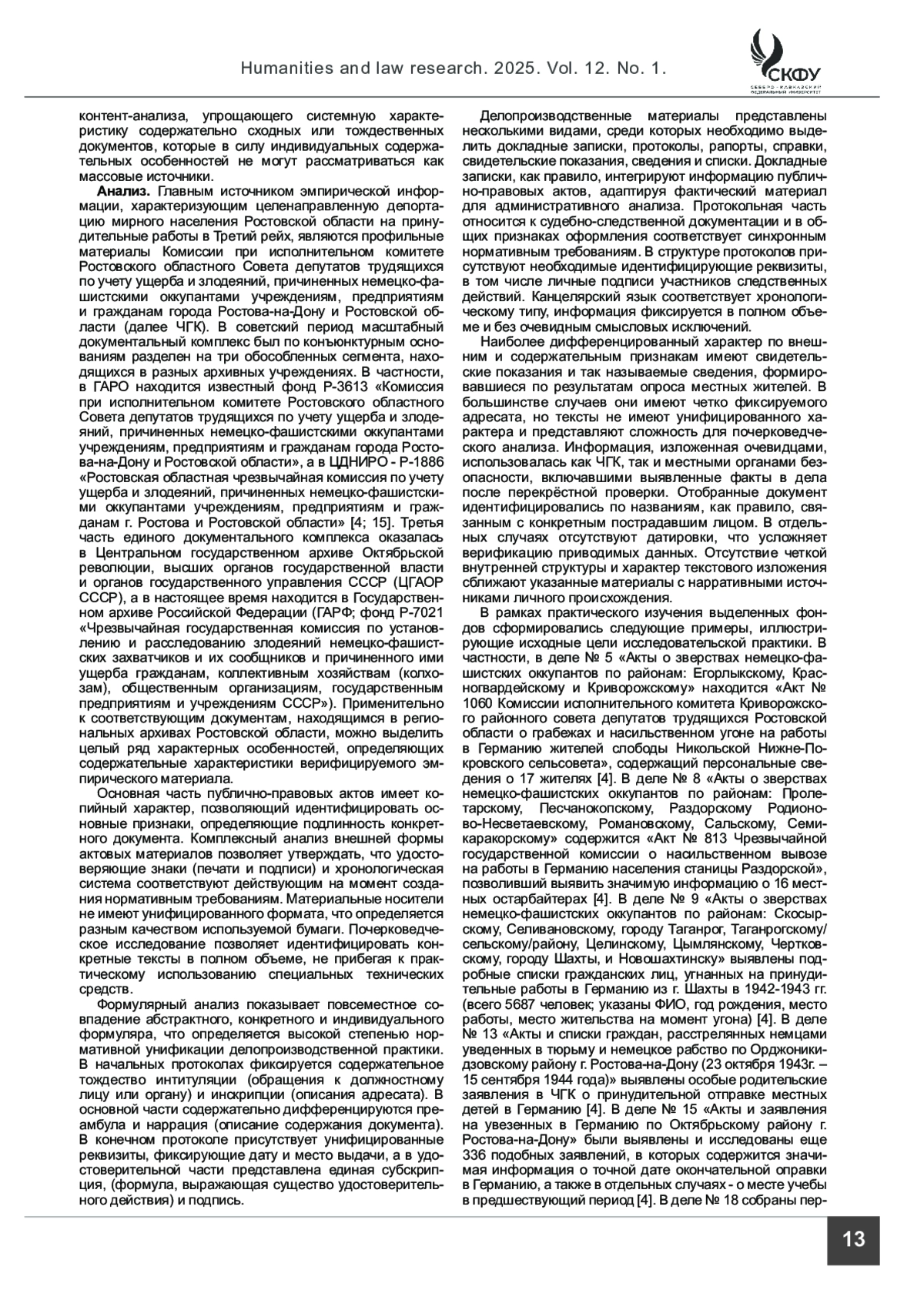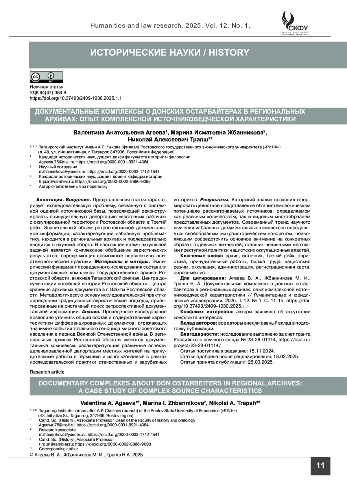 Введение. Представленная статья характеризует исследовательскую проблему, связанную с системной оценкой источниковой базы, позволяющей реконструировать принудительную депортацию «восточных рабочих» с оккупированной территории Ростовской области в Третий рейх. Значительный объем ретроспективной документальной информации, характеризующий избранную проблематику, находится в региональных архивах и последовательно вводится в научный оборот. В настоящее время актуальной задачей является комплексное обобщение эвристических результатов, определяющих возможные перспективы эпистемологической практики.