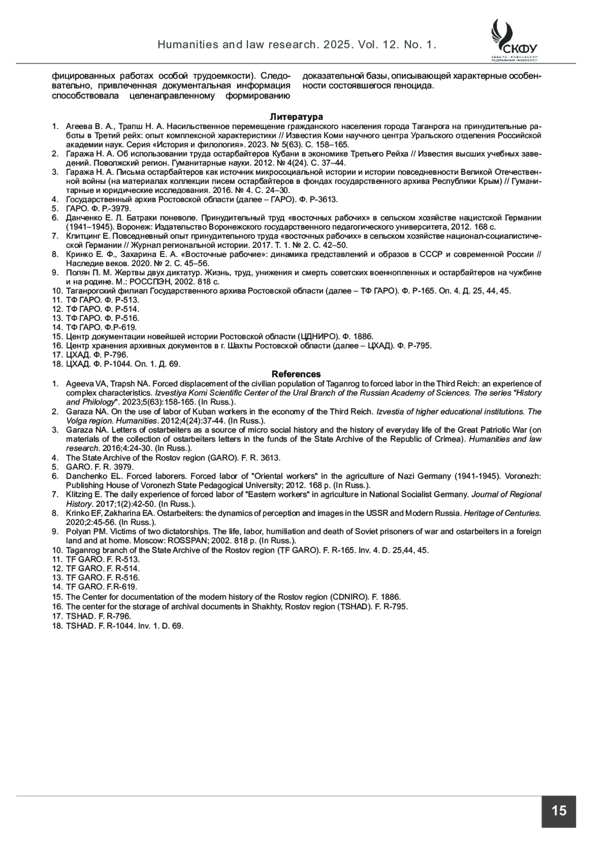 7. Клитцинг Е. Повседневный опыт принудительного труда «восточных рабочих» в сельском хозяйстве национал-социалистической Германии // Журнал региональной истории. 2017. Т. 1. № 2. С. 42-50.