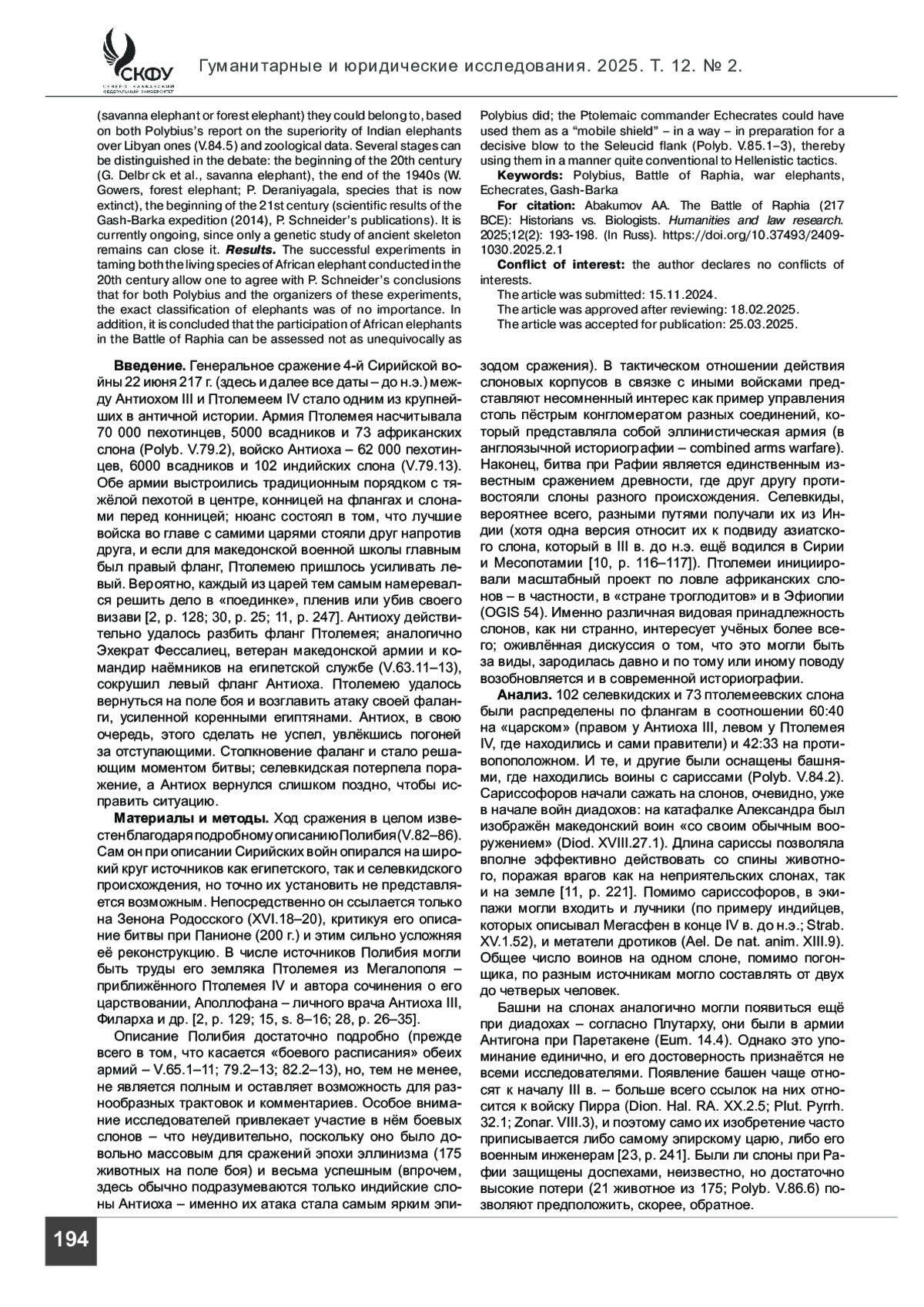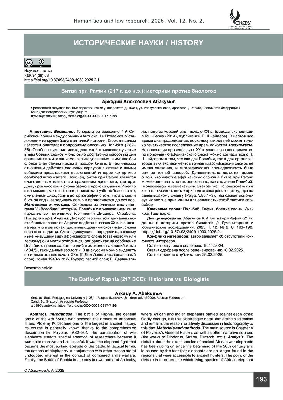 Введение. Генеральное сражение 4-й Сирийской войны между армиями Антиоха III и Птолемея IV стало одним из крупнейших в античной истории. Его ход в целом известен благодаря подробному описанию Полибия (V.82– 86). Особое внимание исследователей привлекает участие в нём боевых слонов – оно было достаточно массовым для сражений эпохи эллинизма, весьма успешным, и именно бой слонов стал самым ярким эпизодом битвы. В тактическом отношении действия слоновых корпусов в связке с иными войсками представляют несомненный интерес как пример combined arms warfare. Наконец, битва при Рафии является единственным известным сражением древности, где друг другу противостояли слоны разного происхождения. Именно этот момент, как ни странно, привлекает учёных более всего; оживлённая дискуссия в историографии о том, что это могли быть за виды, зародилась давно и продолжается до сих пор.
