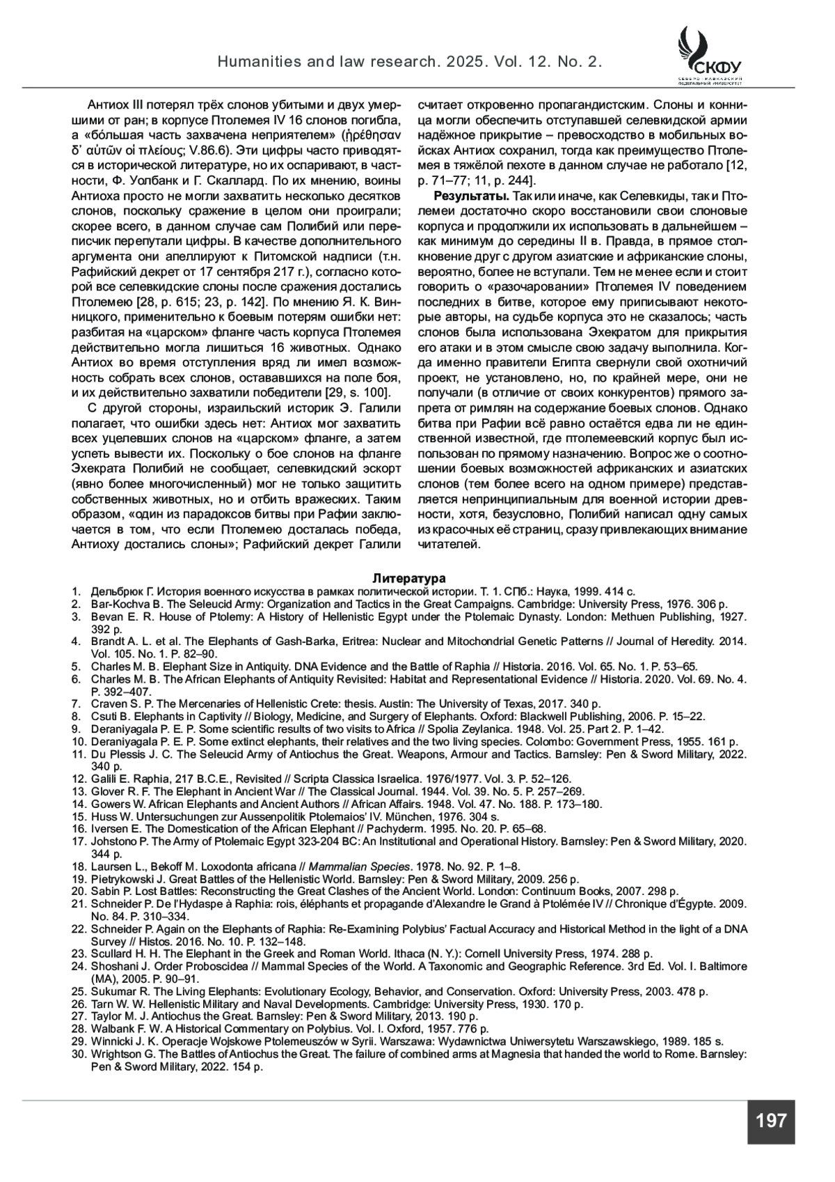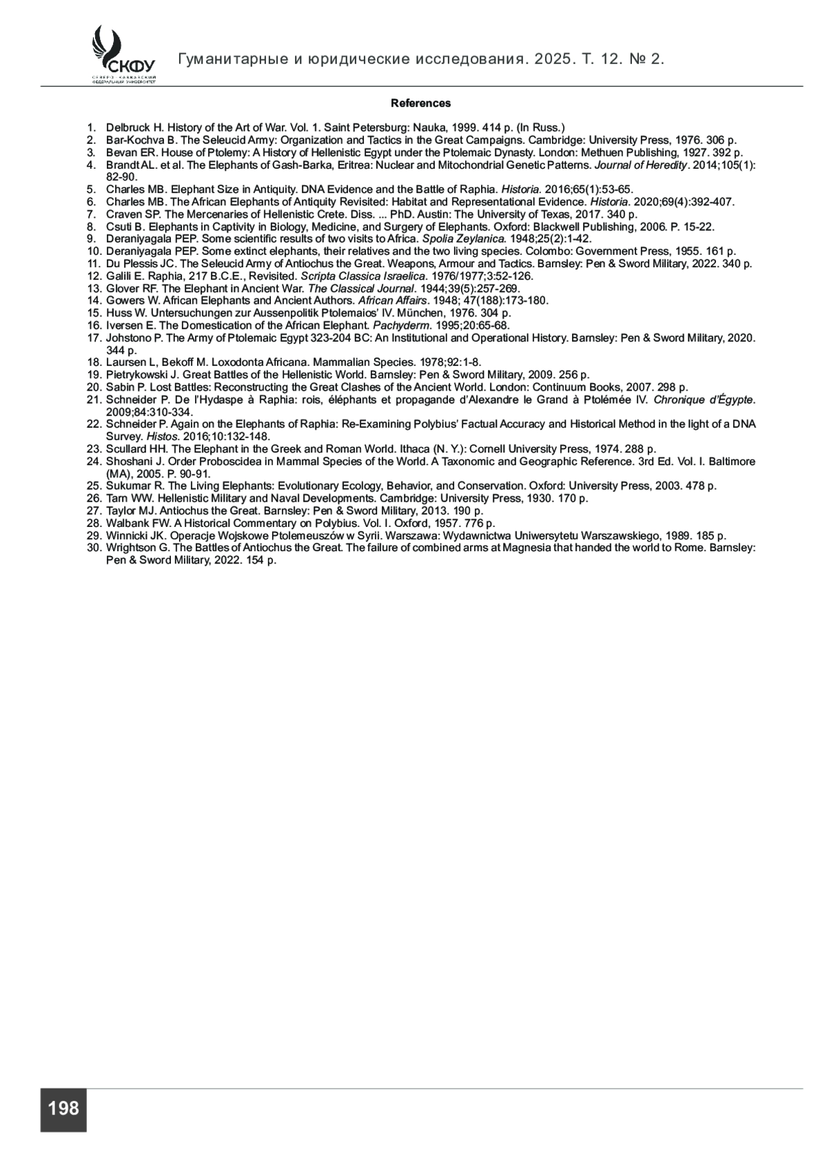 5. Charles M. B. Elephant Size in Antiquity. DNA Evidence and the Battle of Raphia // Historia. 2016. Vol. 65. No. 1. P. 53-65.