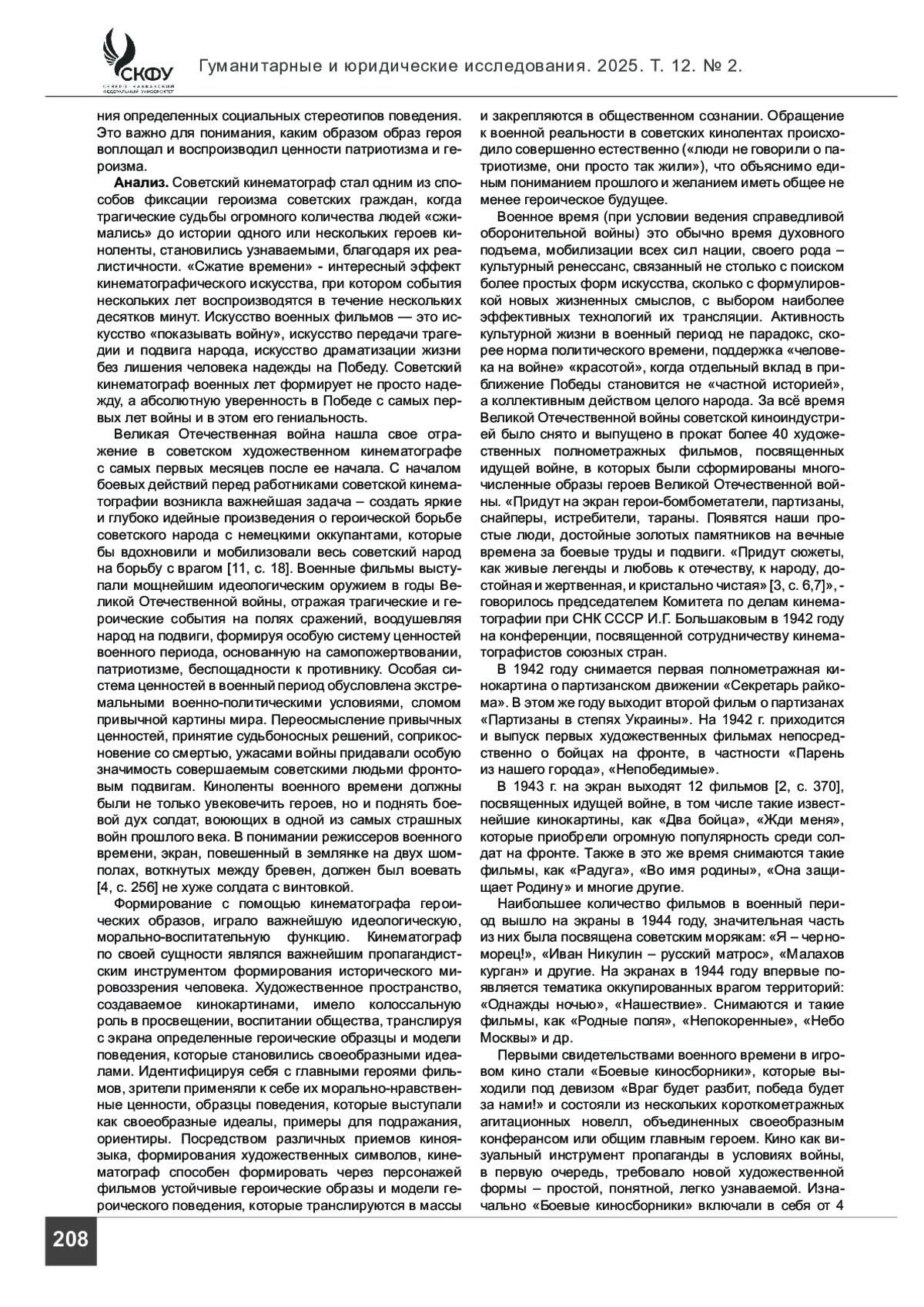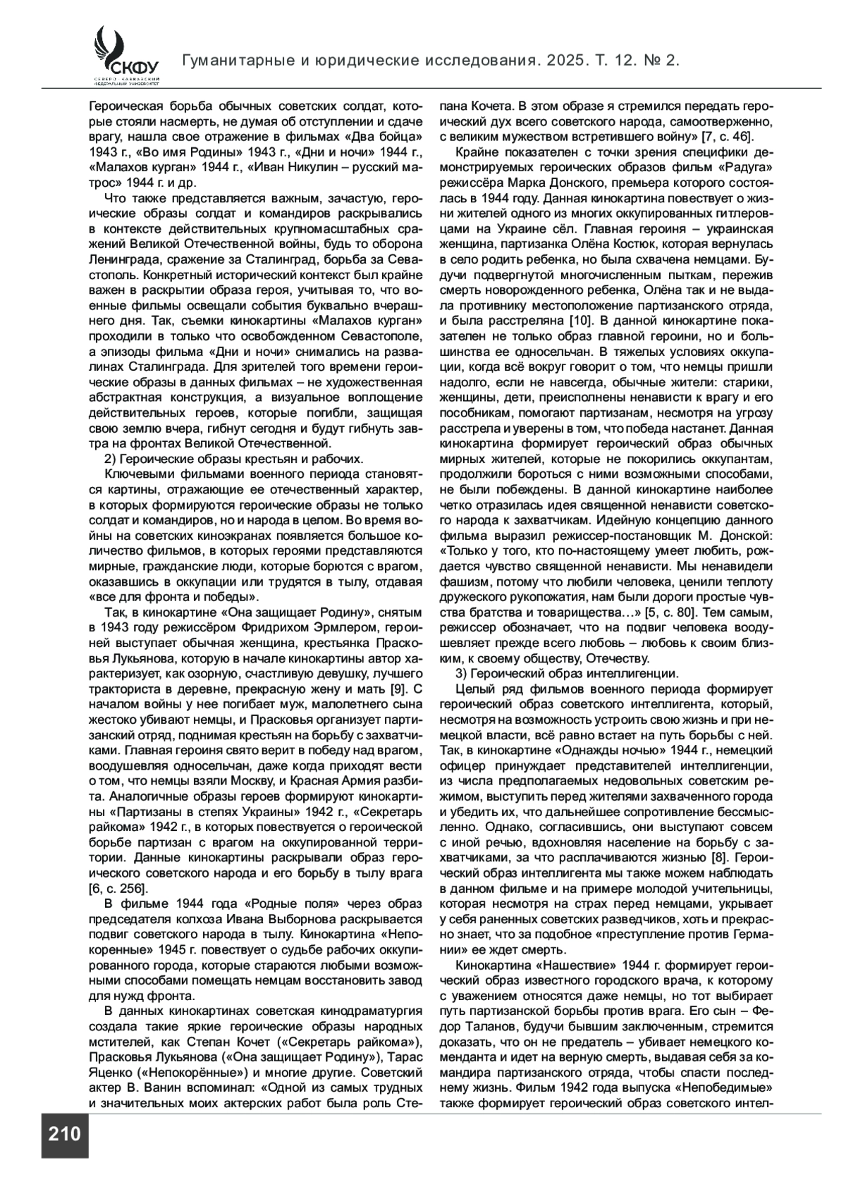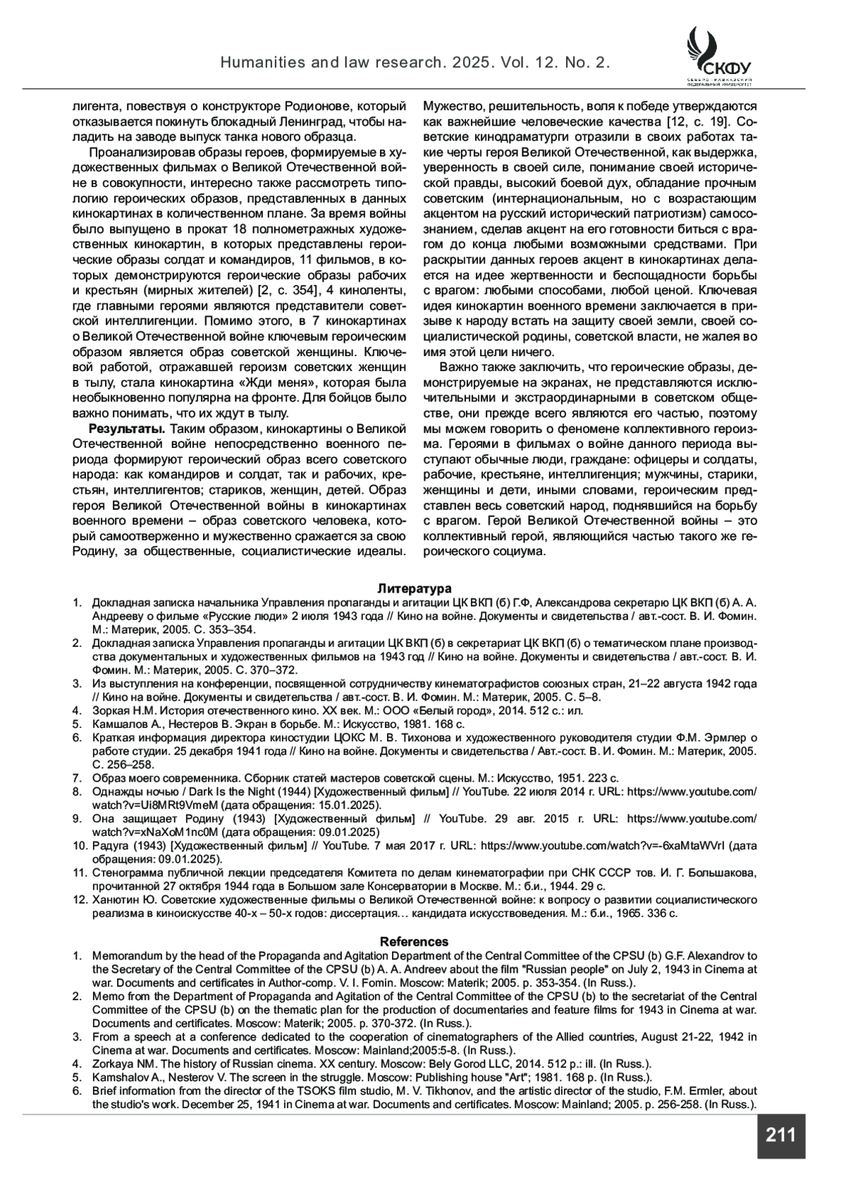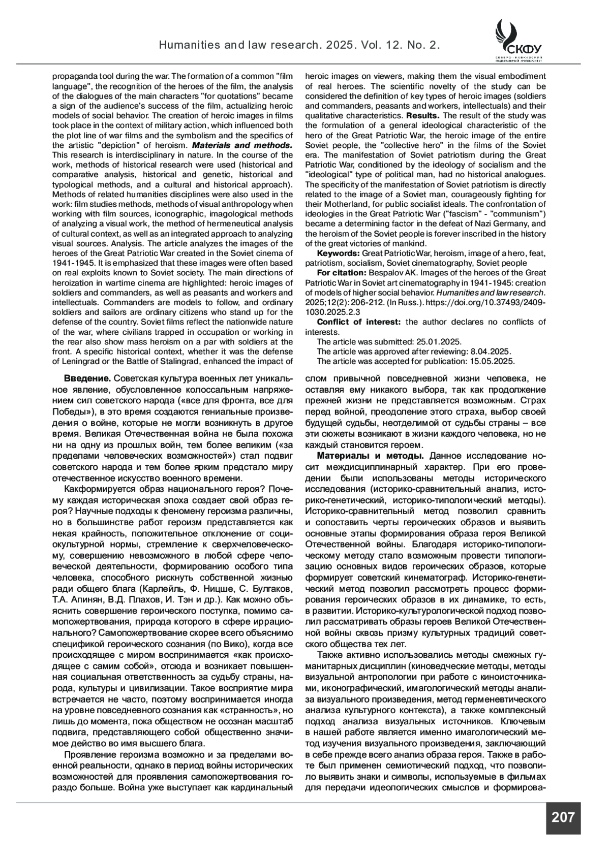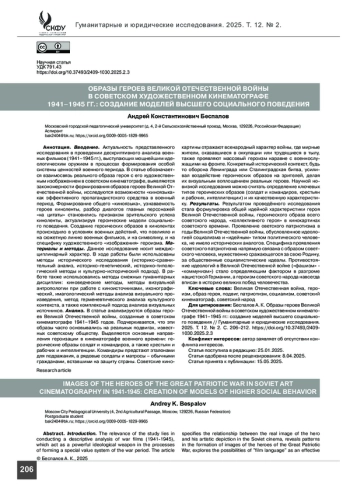 Анализ. В статье анализируются образы героев Великой Отечественной войны, созданные в советском кинематографе 1941–1945 годов. Подчеркивается, что эти образы часто основывались на реальных подвигах, известных советскому обществу. Выделяются основные направления героизации в кинематографе военного времени: героические образы солдат и командиров, а также крестьян и рабочих и интеллигенции. Командиры предстают эталонами для подражания, а рядовые солдаты и матросы – обычными гражданами, вставшими на защиту страны. Советские кинокартины отражают всенародный характер войны, где мирные жители, оказавшиеся в оккупации или трудящиеся в тылу, также проявляют массовый героизм наравне с военнослужащими на фронте. Конкретный исторический контекст, будь то оборона Ленинграда или Сталинградская битва, усиливал воздействие героических образов на зрителей, делая их визуальным воплощением реальных героев. Научной новизной исследования можно считать определение ключевых типов героических образов (солдат и командиров, крестьян и рабочих, интеллигенции) и их качественную характеристику.