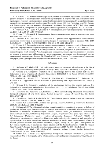 1. 	Андреева А. Е., Гадиев Р. Р. Уральские цеолиты - источник макро- и микроэлементов в рационе кур-несушек // Известия Оренбургского государственного аграрного университета. 2006. № 12(62). С. 20-22. EDN: QAUCBP