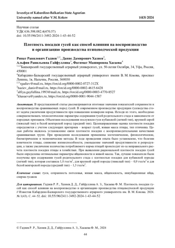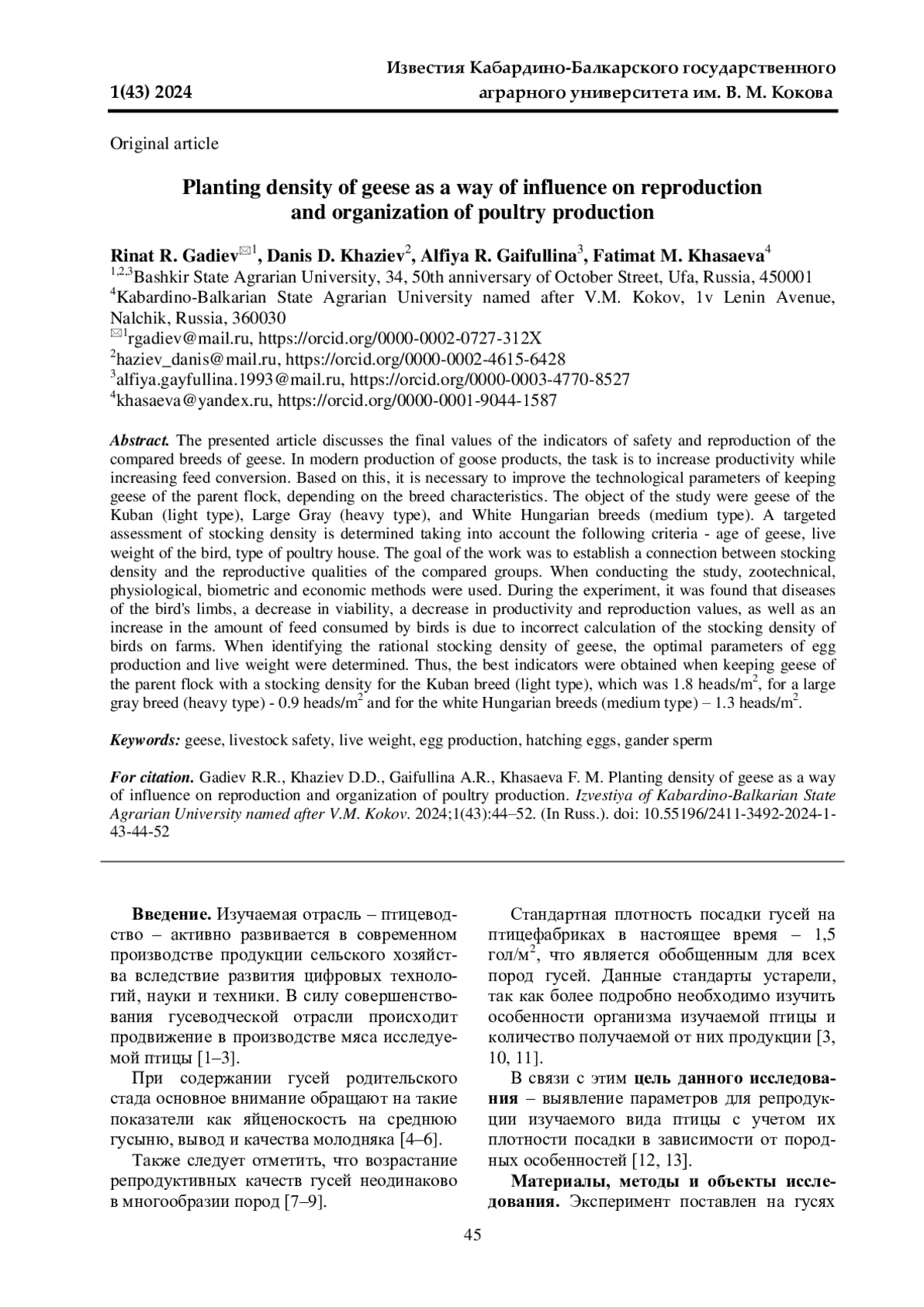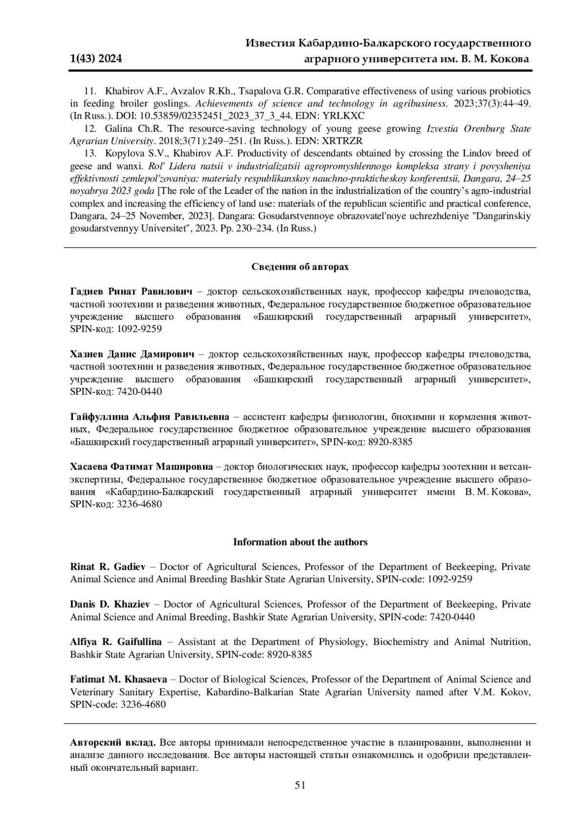 6. 	Фаррахов А. Р., Гадиев Р. Р., Гарифуллин Р. Р. Продуктивность гусей различных пород и помесей // Птицеводство. 2006. № 8. С. 2. EDN: NZVIMZ