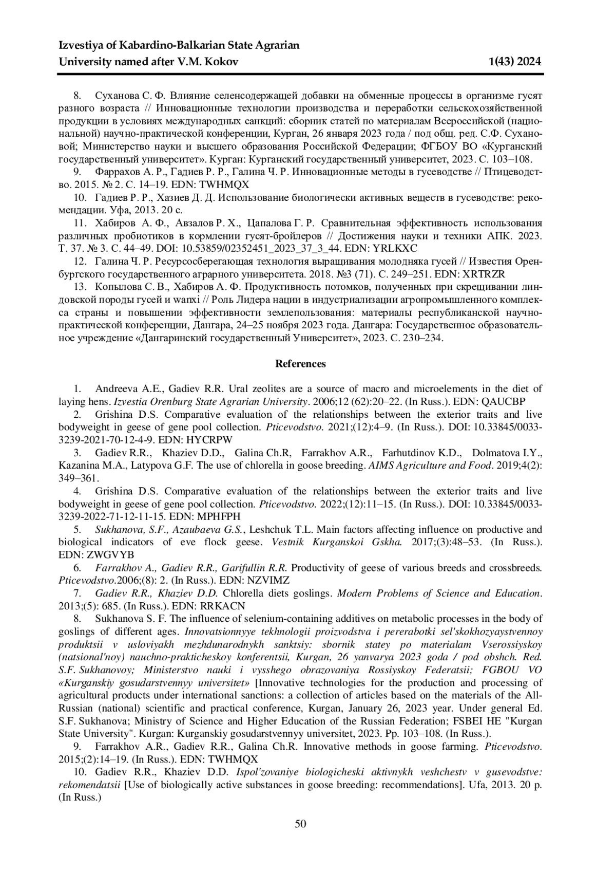 10. 	Гадиев Р. Р., Хазиев Д. Д. Использование биологически активных веществ в гусеводстве: рекомендации. Уфа, 2013. 20 с. EDN: PPMIHR