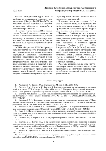 5. 	Колосова С. Ф., Акимбаев Д. Е., Кашкарова И. В., Диденко Т. А. Перспективы инструментального осеменения пчелиных маток // Молодой ученый. 2017. № 32(166). С. 35-39. EDN: ZDNRER