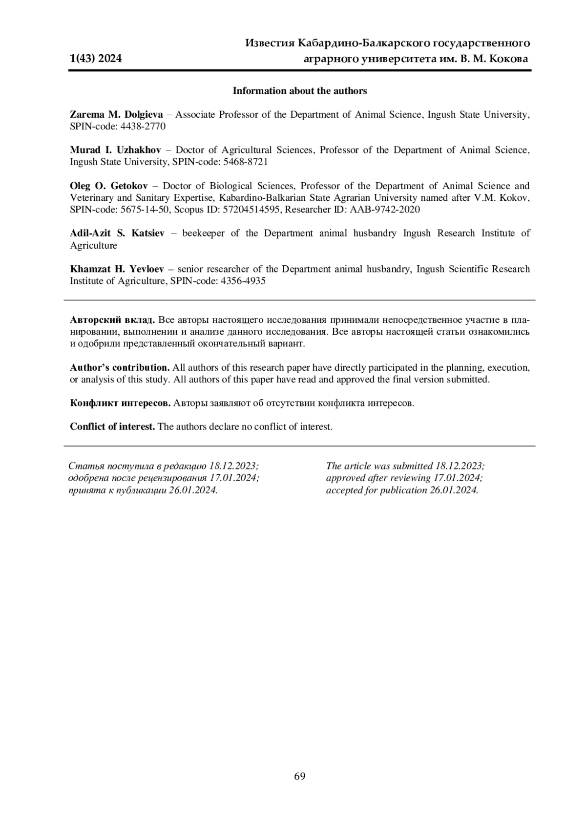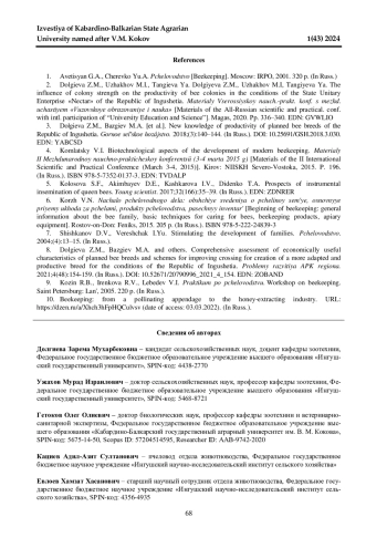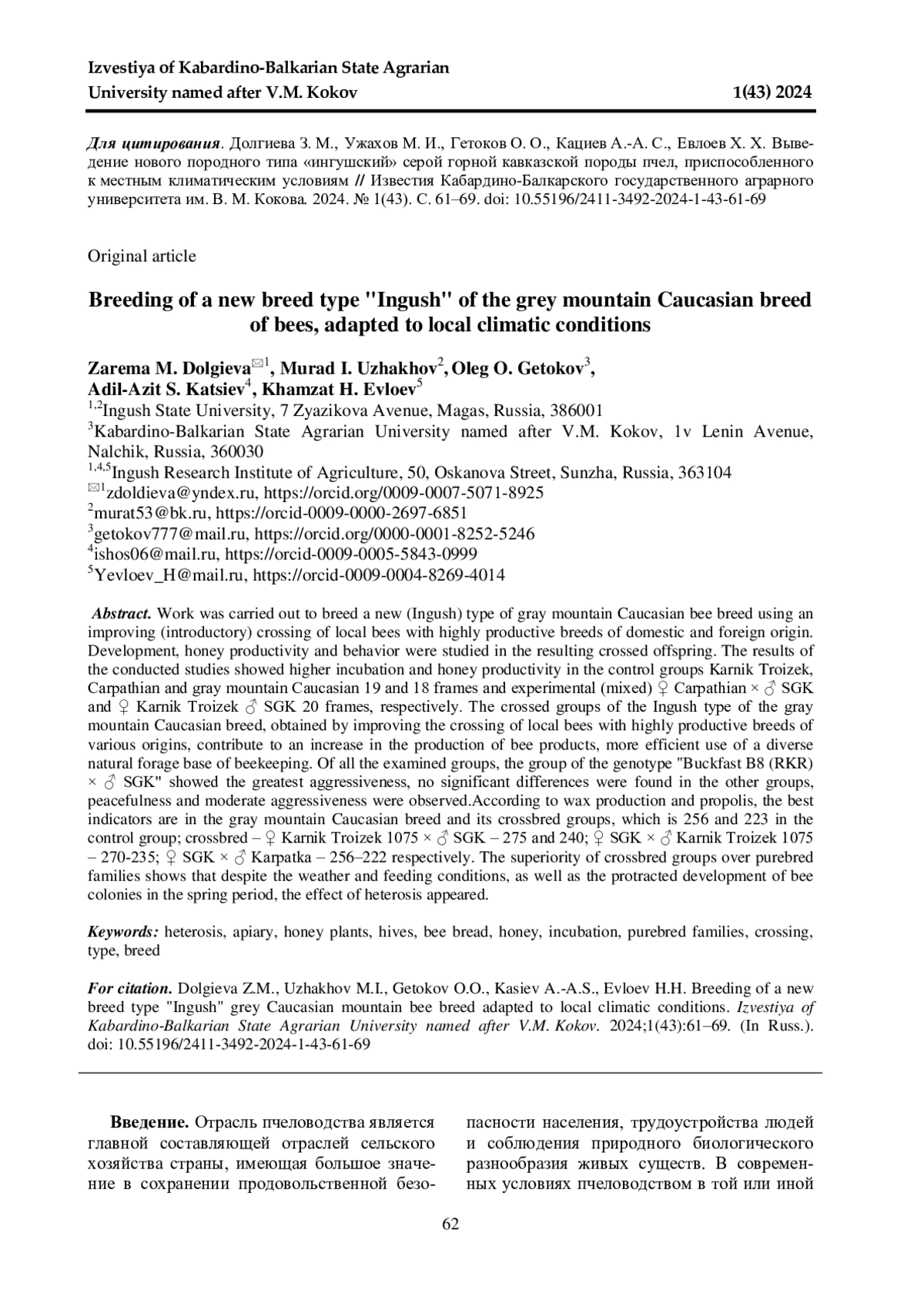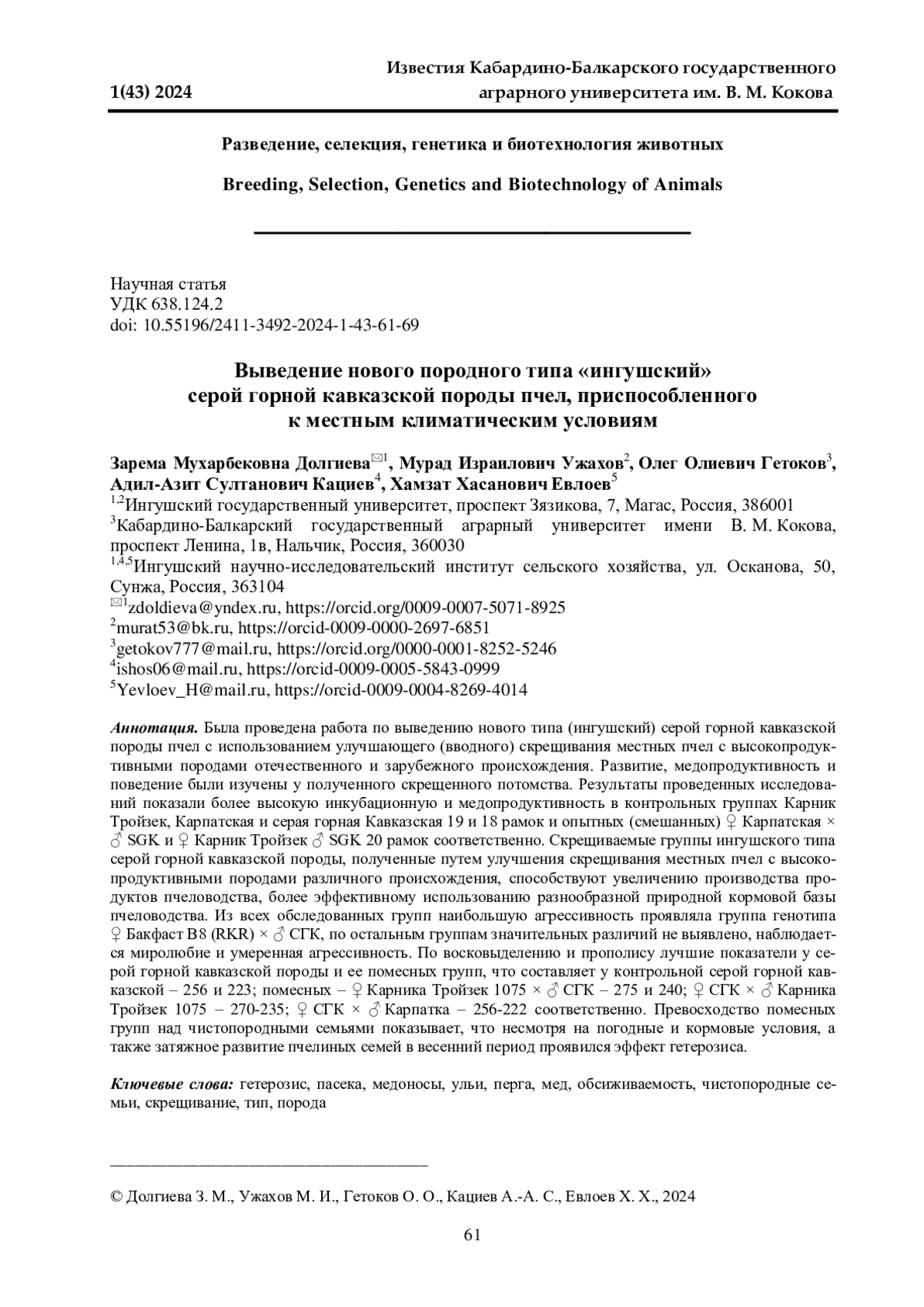 3. 	Долгиева З. М., Базгиев М. А. и др. Новые знания продуктивности плановых пород пчел Республики Ингушетия // Горное сельское хозяйство. 2018. №3. С. 140-144. DOI: 10.25691/GSH.2018.3.030 EDN: YABCSD