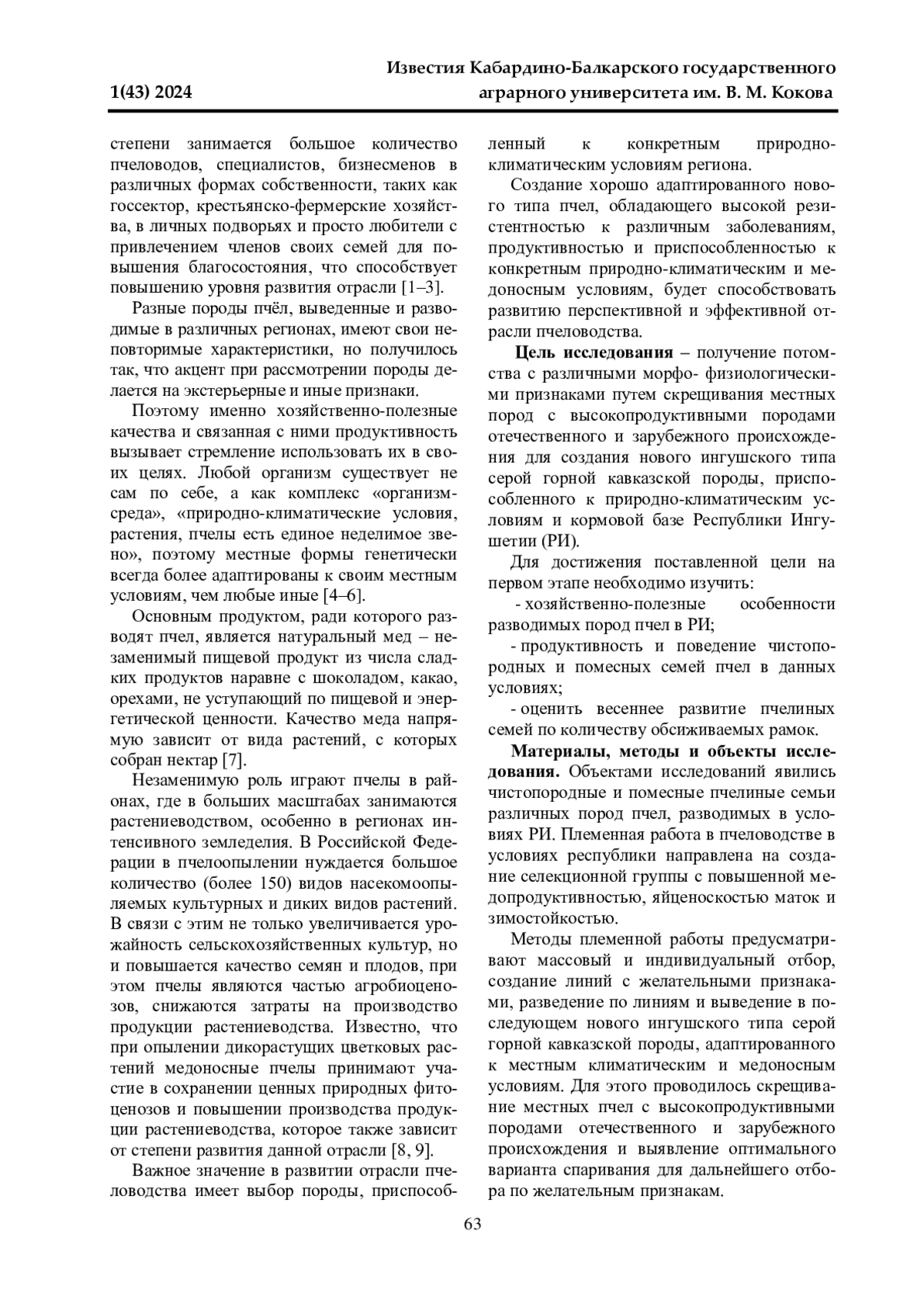 Была проведена работа по выведению нового типа (ингушский) серой горной кавказской породы пчел с использованием улучшающего (вводного) скрещивания местных пчел с высокопродуктивными породами отечественного и зарубежного происхождения. Развитие, медопродуктивность и поведение были изучены у полученного скрещенного потомства. Результаты проведенных исследований показали более высокую инкубационную и медопродуктивность в контрольных группах Карник Тройзек, Карпатская и серая горная Кавказская 19 и 18 рамок и опытных (смешанных) ♀ Карпатская × ♂ SGK и ♀ Карник Тройзек ♂ SGK 20 рамок соответственно. Скрещиваемые группы ингушского типа серой горной кавказской породы, полученные путем улучшения скрещивания местных пчел с высокопродуктивными породами различного происхождения, способствуют увеличению производства продуктов пчеловодства, более эффективному использованию разнообразной природной кормовой базы пчеловодства. Из всех обследованных групп наибольшую агрессивность проявляла группа генотипа ♀ Бакфаст В8 (RKR) × ♂ СГК, по остальным группам значительных различий не выявлено, наблюдается миролюбие и умеренная агрессивность. По восковыделению и прополису лучшие показатели у серой горной кавказской породы и ее помесных групп, что составляет у контрольной серой горной кавказской - 256 и 223; помесных - ♀ Карника Тройзек 1075 × ♂ СГК - 275 и 240; ♀ СГК × ♂ Карника Тройзек 1075 - 270-235; ♀ СГК × ♂ Карпатка - 256-222 соответственно. Превосходство помесных групп над чистопородными семьями показывает, что несмотря на погодные и кормовые условия, а также затяжное развитие пчелиных семей в весенний период проявился эффект гетерозиса.