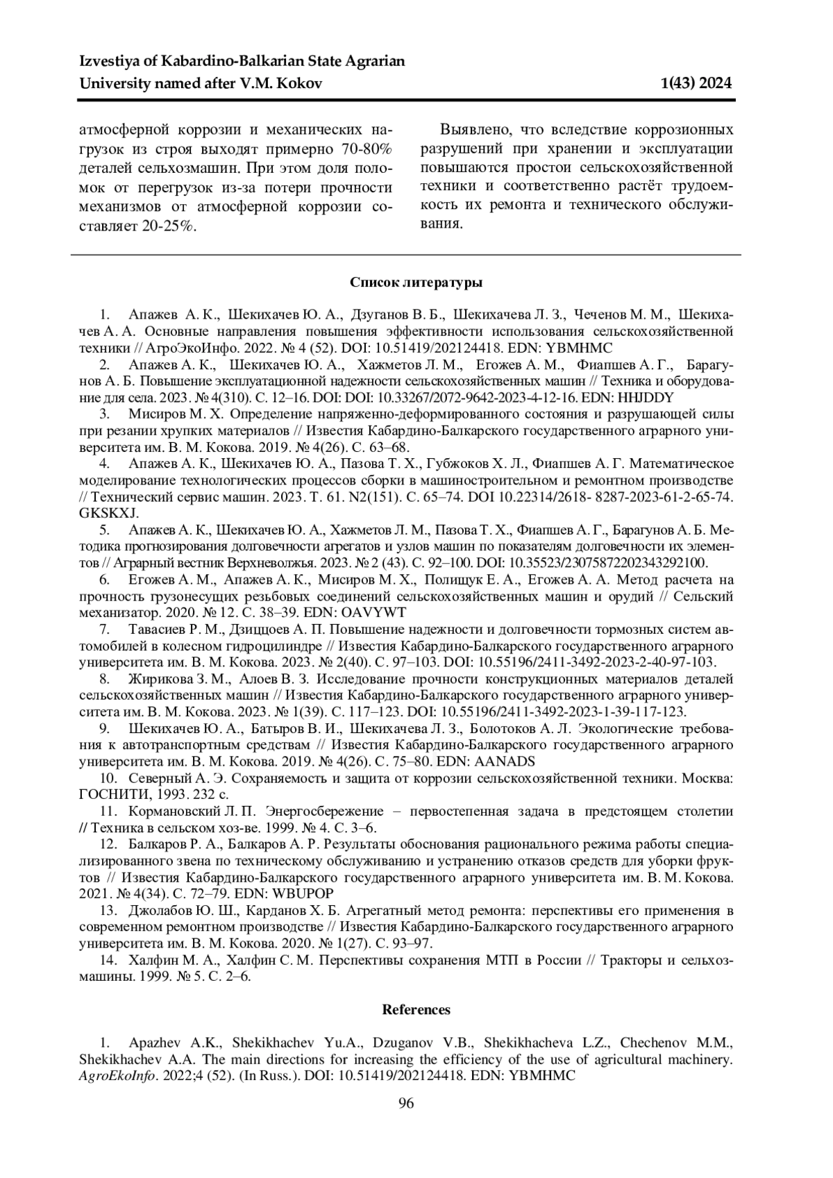 1. Апажев А. К., Шекихачев Ю. А., Дзуганов В. Б., Шекихачева Л. З., Чеченов М. М., Шекихачев А. А. Основные направления повышения эффективности использования сельскохозяйственной техники // АгроЭкоИнфо. 2022. № 4 (52). DOI: 10.51419/202124418 EDN: YBMHMC