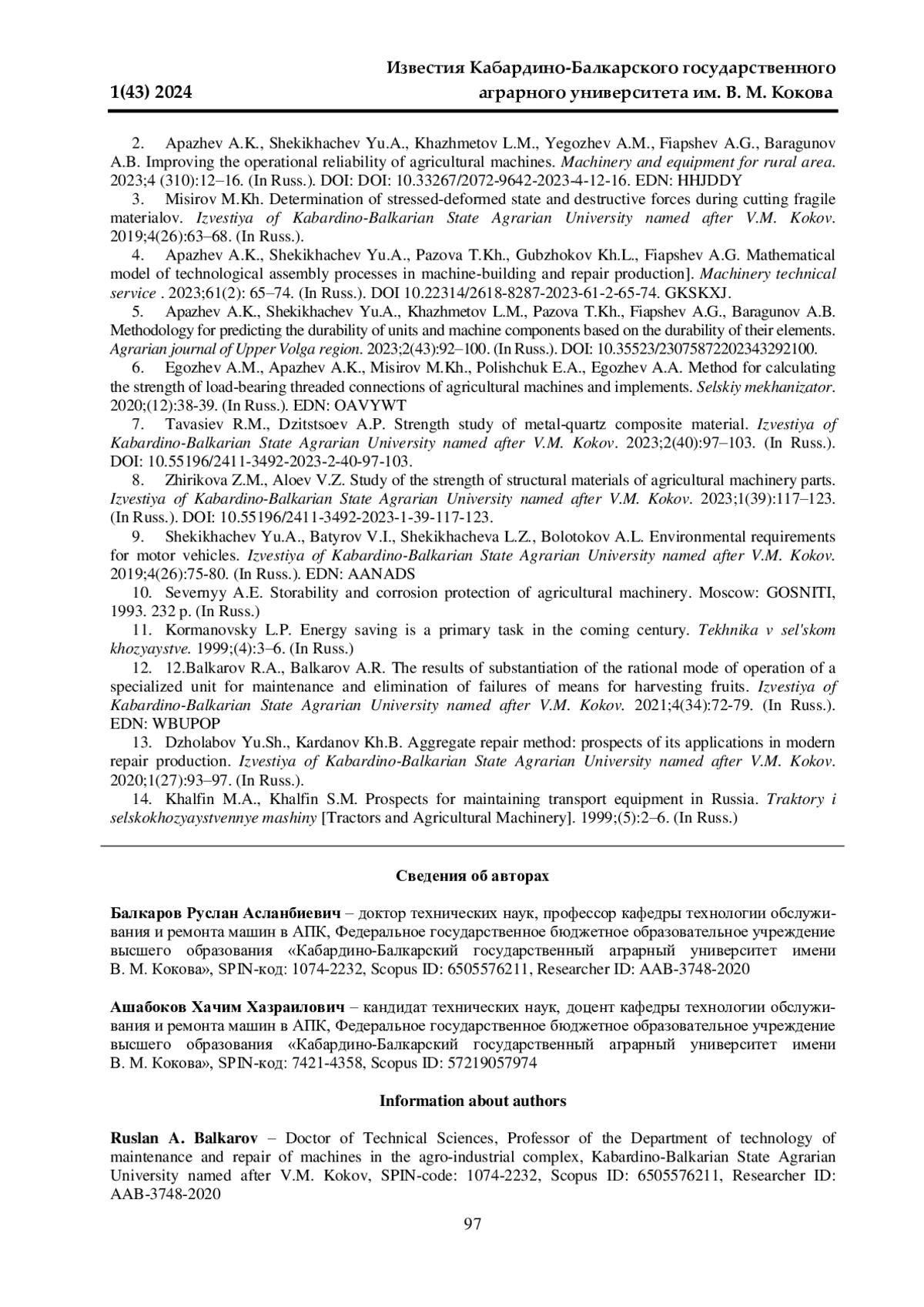 2. Апажев А. К., Шекихачев Ю. А., Хажметов Л. М., Егожев А. М., Фиапшев А. Г., Барагунов А. Б. Повышение эксплуатационной надежности сельскохозяйственных машин // Техника и оборудование для села. 2023. № 4(310). С. 12-16. DOI: 10.33267/2072-9642-2023-4-12-16 EDN: HHJDDY