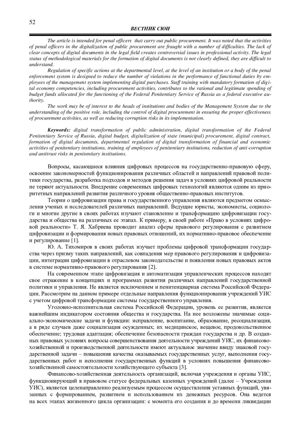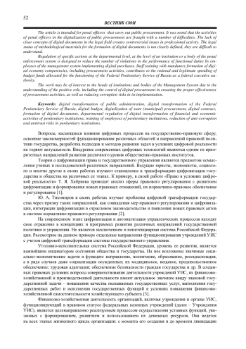 Вопросы, касающиеся влияния цифровых процессов на государственно-правовую сферу, освоение закономерностей функционирования различных областей и направлений правовой политики государства, разработка подходов и методов решения задач в условиях цифровой реальности не теряют актуальности. Внедрение современных цифровых технологий являются одним из приоритетных направлений развития различного уровня общественно-правовых институтов.