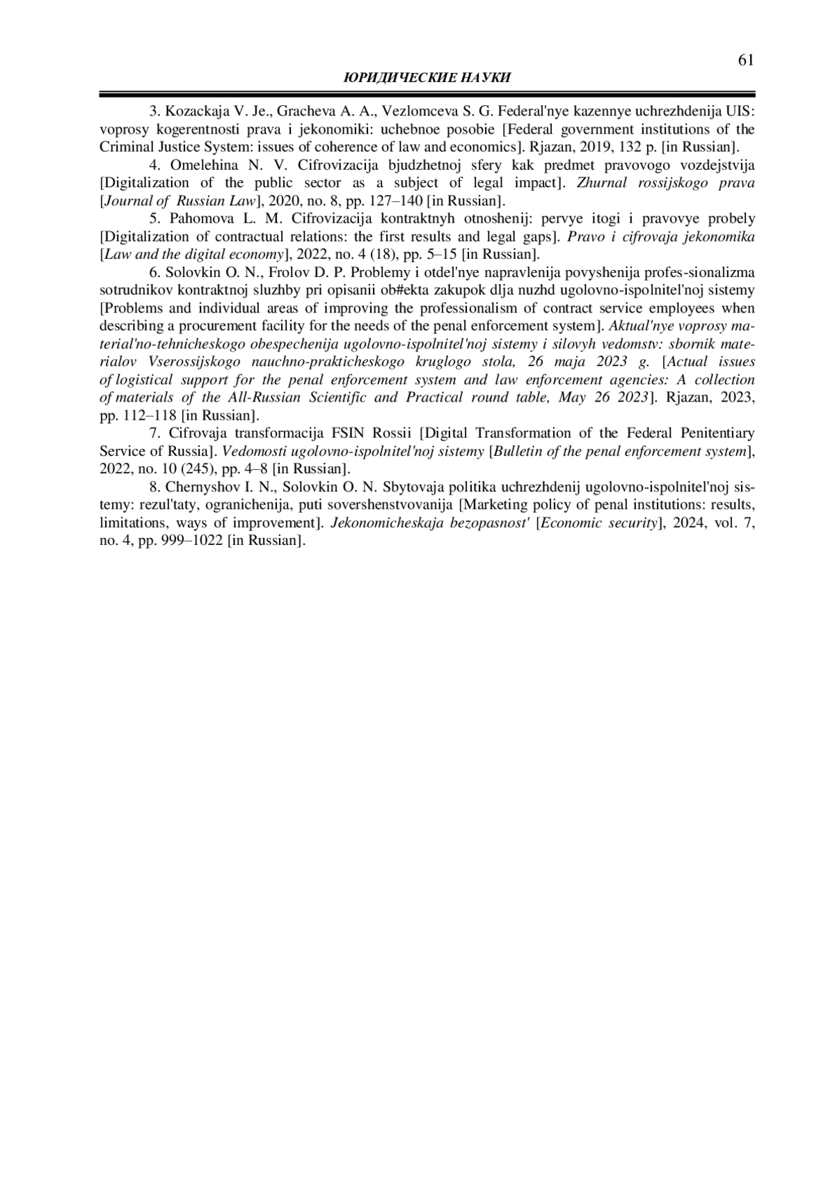 8. 	Чернышов И. Н., Соловкин О. Н. Сбытовая политика учреждений уголовно-исполнительной системы: результаты, ограничения, пути совершенствования // Экономическая безопасность. 2024. Т. 7. № 4. С. 999-1022. EDN: SDGOFP