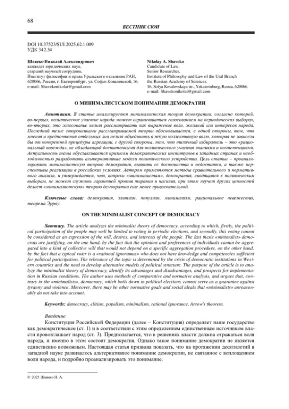 В статье анализируется минималистская теория демократии, согласно которой, во-первых, политическое участие народа может ограничиваться голосованием на периодических выборах, во-вторых, это голосование нельзя рассматривать как выражение воли, желаний или интересов народа. Последний тезис сторонниками рассматриваемой теории обосновывается, с одной стороны, тем, что мнения и предпочтения отдельных лиц нельзя объединить в некую коллективную волю, которая не зависела бы от конкретной процедуры агрегации, с другой стороны, тем, что типичный избиратель - это «рациональный невежда», не обладающий достаточными для политического участия знаниями и компетенциями. Актуальность темы обуславливается кризисом демократических институтов в западных странах и необходимостью разработать альтернативные модели политического устройства. Цель статьи - проанализировать минималистскую теорию демократии, выявить ее достоинства и недостатки, а также перспективы реализации в российских условиях. Автором применяются методы сравнительного и нормативного анализа, и утверждается, что, вопреки «минималистам», демократия, сводящаяся к политическим выборам, не может служить гарантией против тирании и насилия, при этом неучет других ценностей делает «минималистскую» теорию демократии еще менее привлекательной.