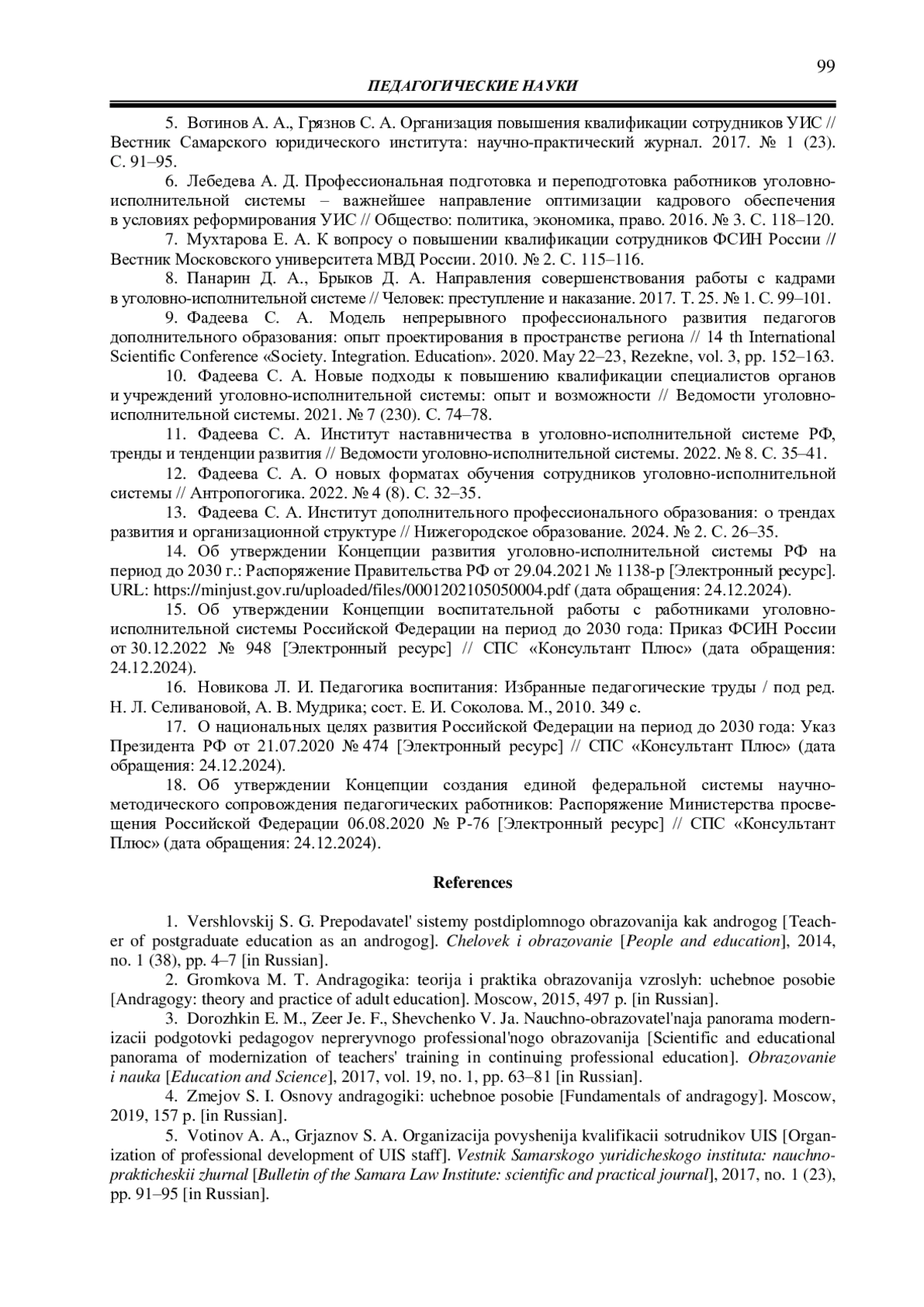 12. 	Фадеева С. А. О новых форматах обучения сотрудников уголовно-исполнительной системы // Антропогогика. 2022. № 4 (8). С. 32-35. EDN: GTUMVJ