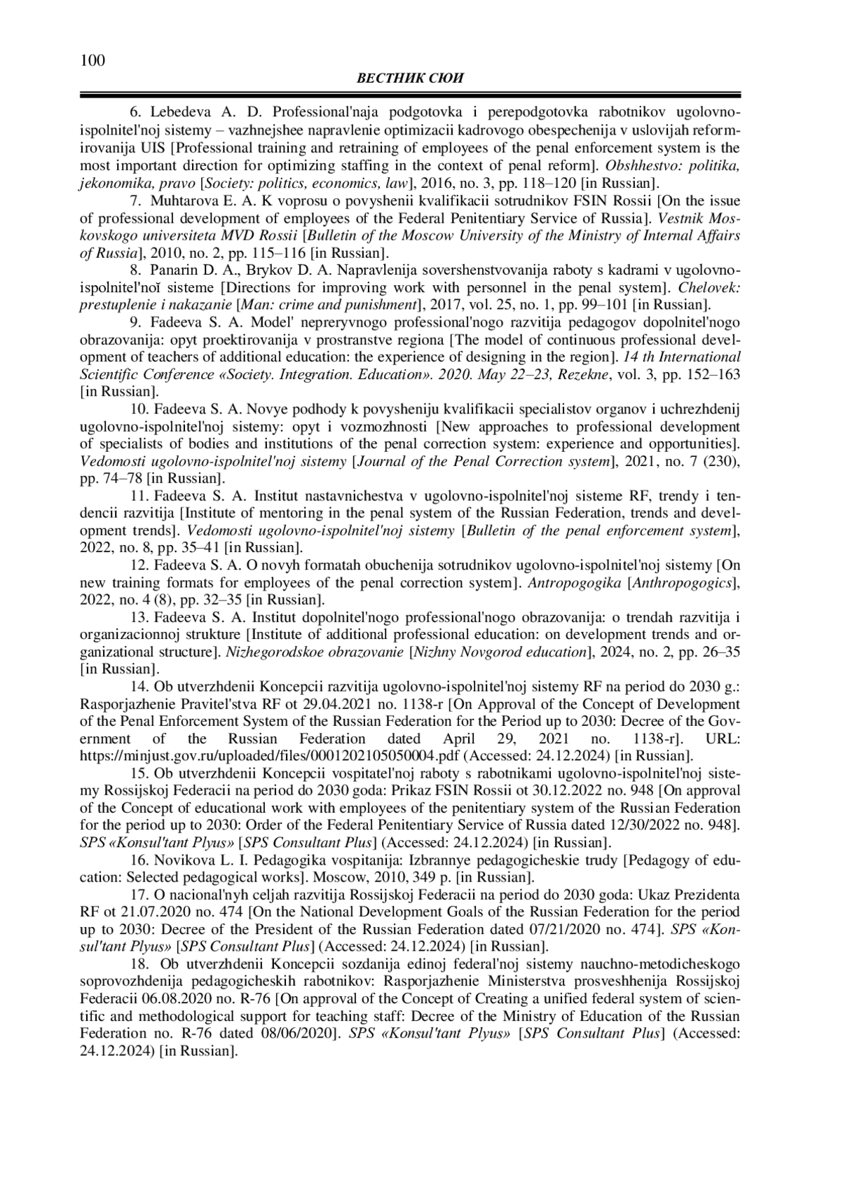 10. 	Фадеева С. А. Новые подходы к повышению квалификации специалистов органов и учреждений уголовно-исполнительной системы: опыт и возможности // Ведомости уголовно-исполнительной системы. 2021. № 7 (230). С. 74-78. EDN: ETHXQG