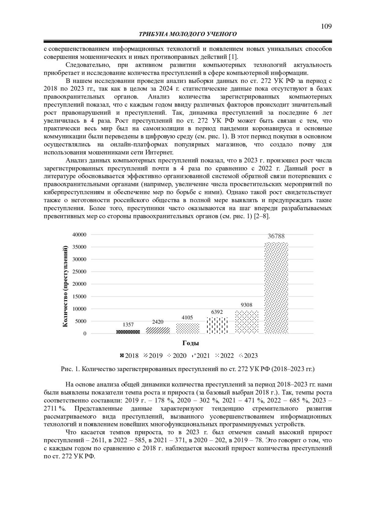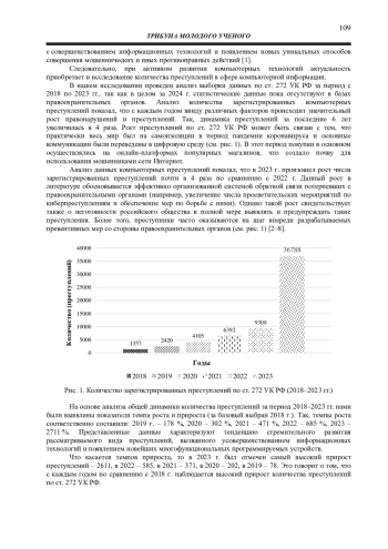 В работе также изучены и представлены результаты вычисления уровней динамического ряда по количеству зарегистрированных преступлений по ст. 272 УК РФ за 2018-2022 гг. с прогнозом на 2023-2024 гг. о непрерывном росте компьютерных преступлений в будущем, что подтверждают статические данные о количестве преступлений за 2023 г. Данные в целом за 2024 г. на момент проведения исследования не предоставлены в официальных базах правоохранительных органов.