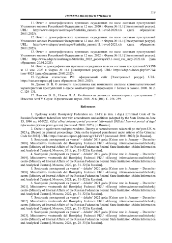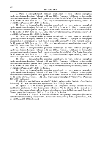 14. 	Отчет о демографических признаках осужденных по всем составам преступлений УК РФ за 12 мес. 2023 г. Форма № 11.1 [Электронный ресурс]. URL: https://cdep.ru/index.php?id=79& item=8823 (дата обращения: 20.01.2025).
