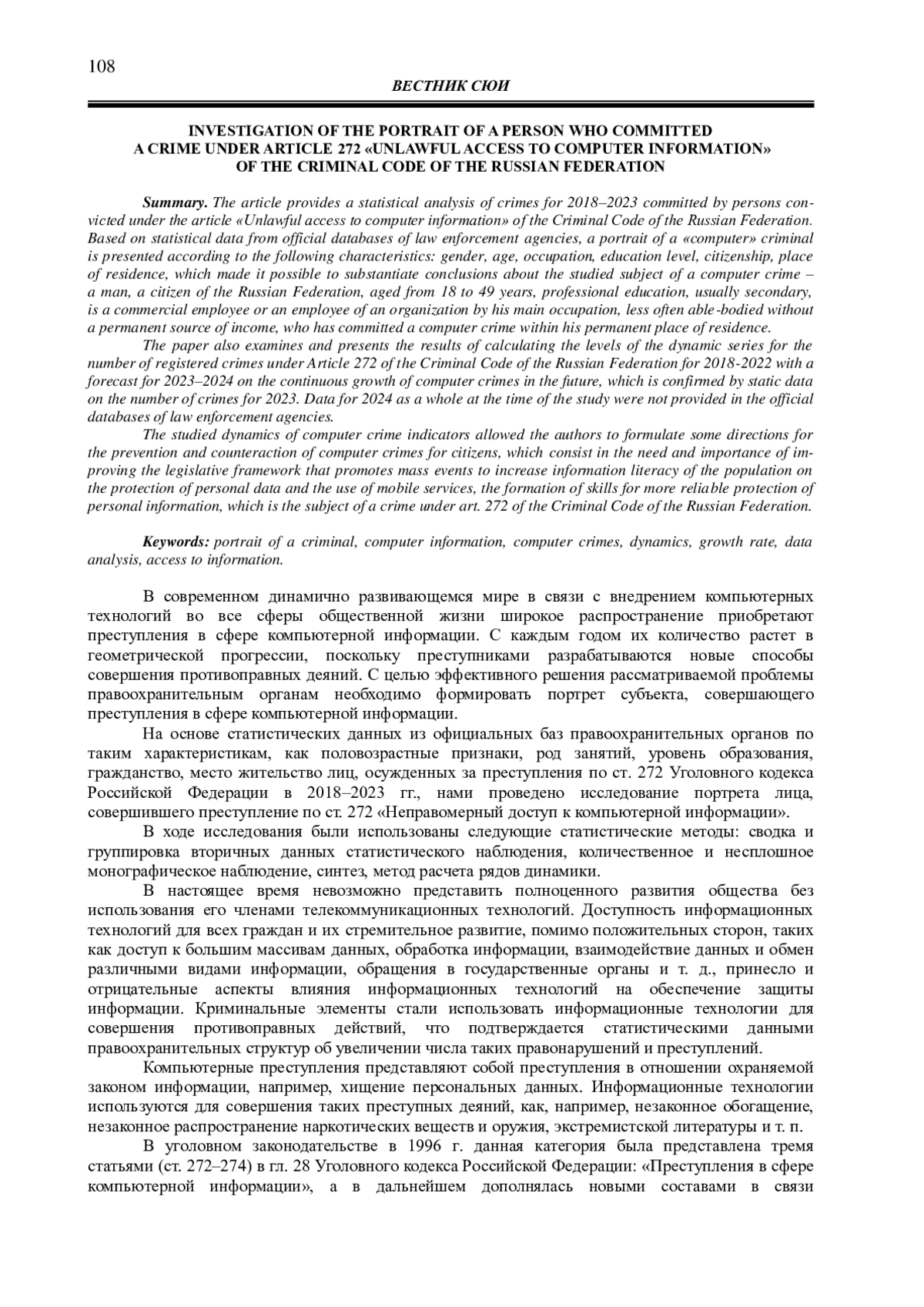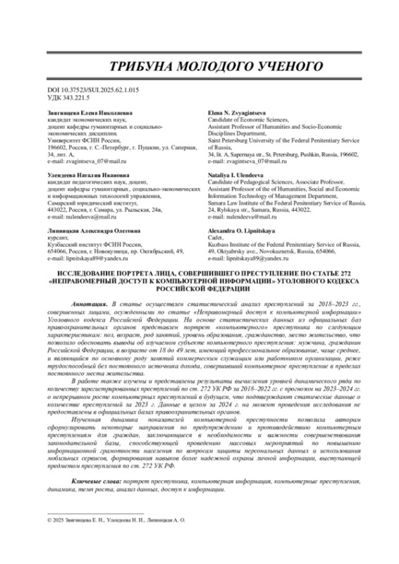 В статье осуществлен статистический анализ преступлений за 2018-2023 гг., совершенных лицами, осужденными по статье «Неправомерный доступ к компьютерной информации» Уголовного кодекса Российской Федерации. На основе статистических данных из официальных баз правоохранительных органов представлен портрет «компьютерного» преступника по следующим характеристикам: пол, возраст, род занятий, уровень образования, гражданство, место жительство, что позволило обосновать выводы об изучаемом субъекте компьютерного преступления: мужчина, гражданин Российской Федерации, в возрасте от 18 до 49 лет, имеющий профессиональное образование, чаще среднее, и являющийся по основному роду занятий коммерческим служащим или работником организации, реже трудоспособный без постоянного источника дохода, совершивший компьютерное преступление в пределах постоянного места жительства.