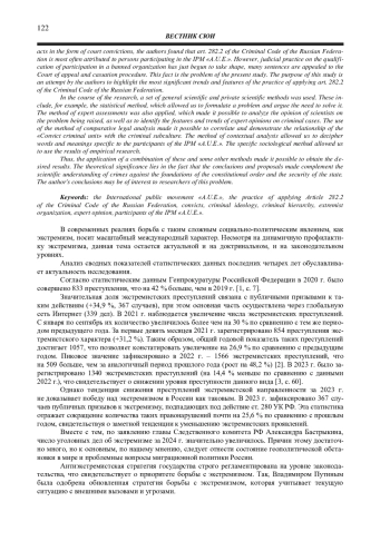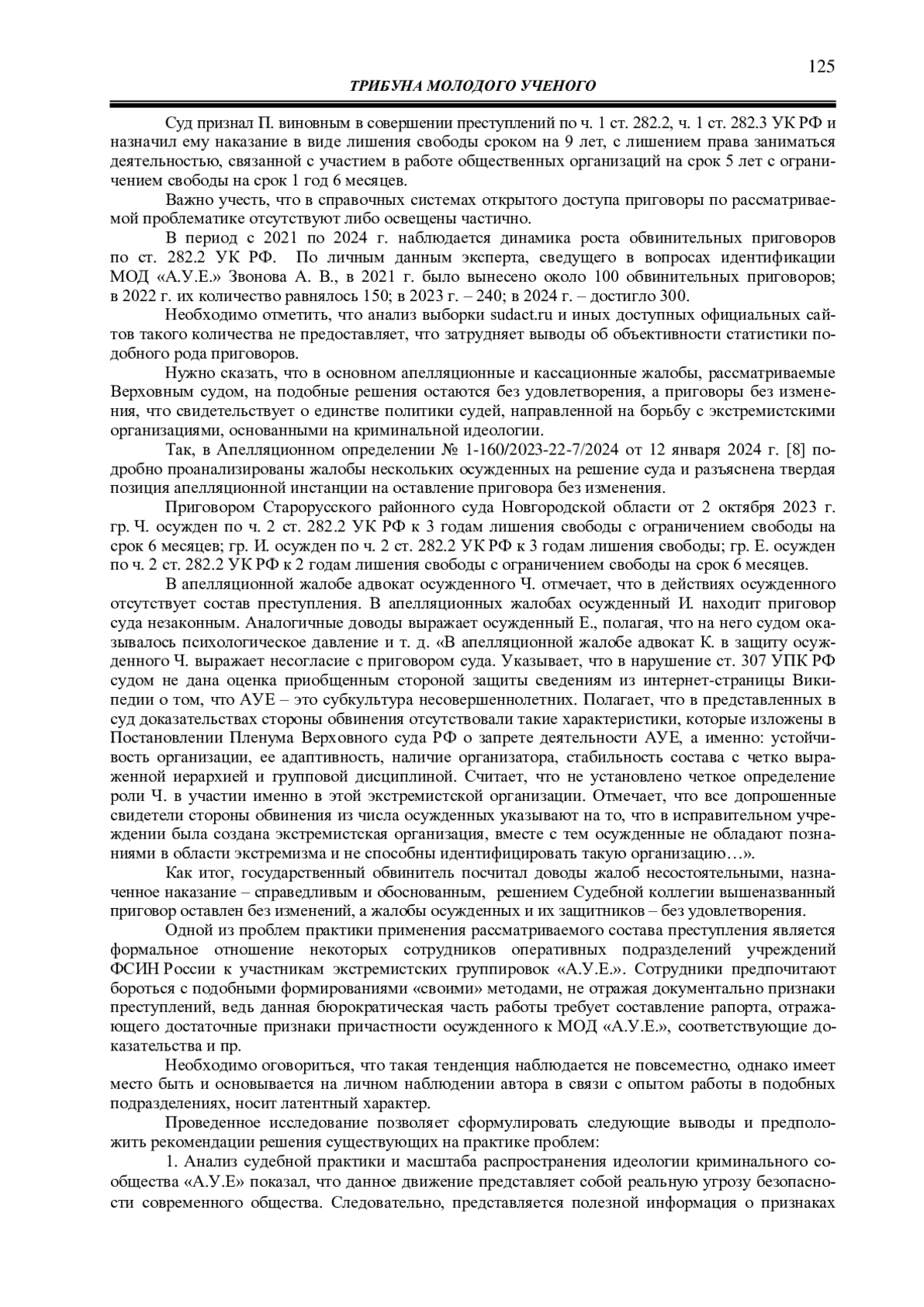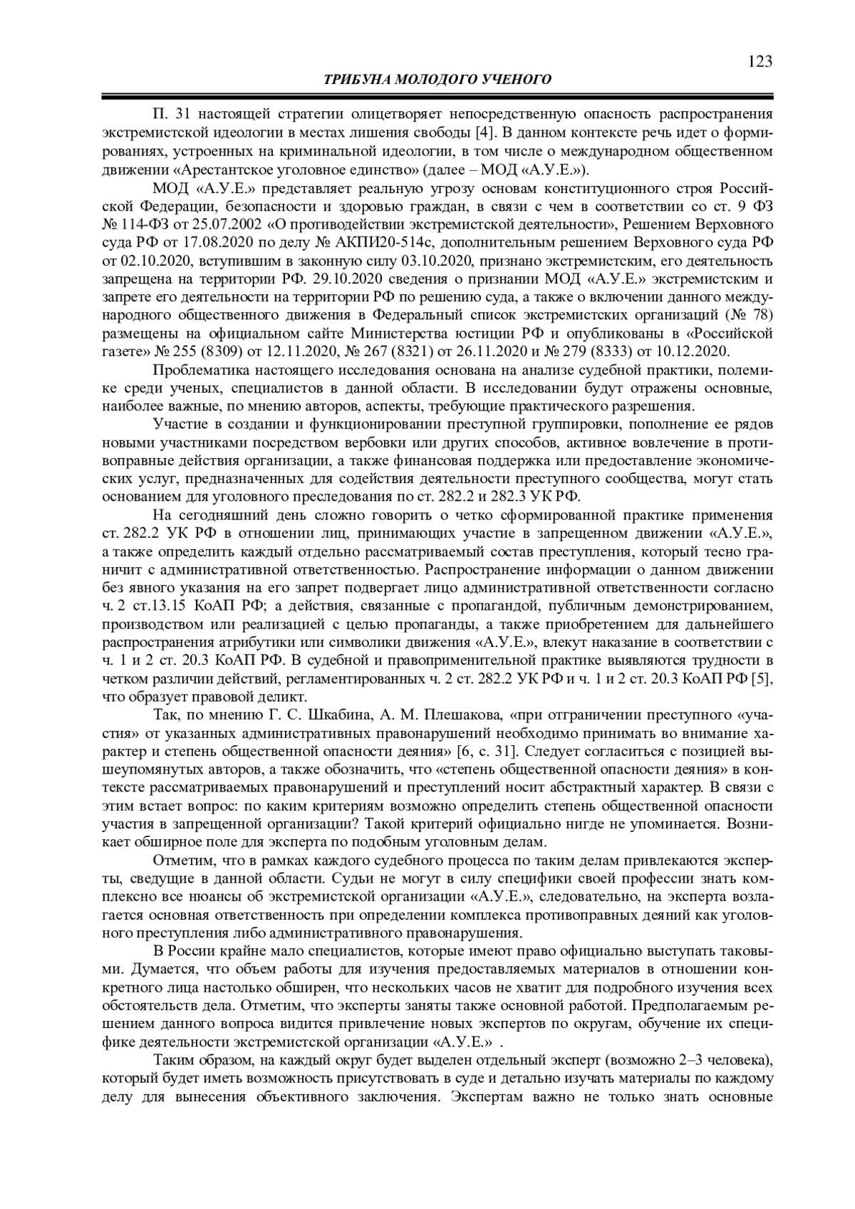 В ходе исследования деятельности запрещенной организации и государственного реагирования на преступные деяния в виде обвинительных приговоров судов авторами установлено, что ст. 282.2 УК РФ наиболее часто вменяется лицам - участникам МОД «А. У. Е.». Однако судебная практика по квалификации участия в запрещенной организации только начала формироваться, многие приговоры обжалуются в апелляционном и кассационном порядке. Данное обстоятельство составляет проблематику настоящего исследования. Целью настоящего исследования является попытка авторов осветить наиболее значимые тенденции и особенности практики применения ст. 282.2 УК РФ. В ходе проведения исследования был использован комплекс общенаучных и частнонаучных методов. К их числу следует отнести, например, статистический метод, который позволил сформулировать проблему и аргументировать необходимость ее решения. Также применен метод экспертных оценок, который позволил проанализировать мнение ученых на поднимаемую проблему, а также выявить особенности и тенденции экспертных заключений по уголовным делам. Использование метода сравнительно-правового анализа позволило провести соотношение и продемонстрировать взаимосвязь «Арестантского уголовного единства» с криминальной субкультурой. Метод контекстуального анализа позволил расшифровать слова и значения, специфичные для участников МОД «А. У. Е.». Конкретно-социологический метод позволил использовать результаты эмпирических исследований. Таким образом, применение совокупности указанных и некоторых других методов позволило получить искомые результаты.