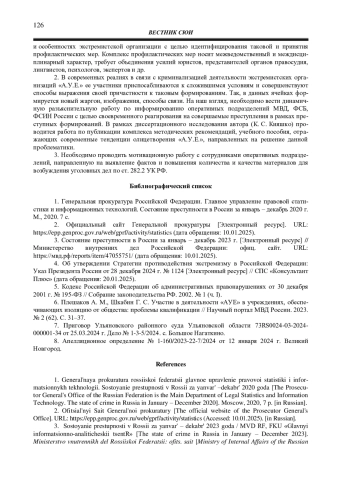 1. 	Генеральная прокуратура Российской Федерации. Главное управление правовой статистики и информационных технологий. Состояние преступности в России за январь - декабрь 2020 г. М., 2020. 7 с.