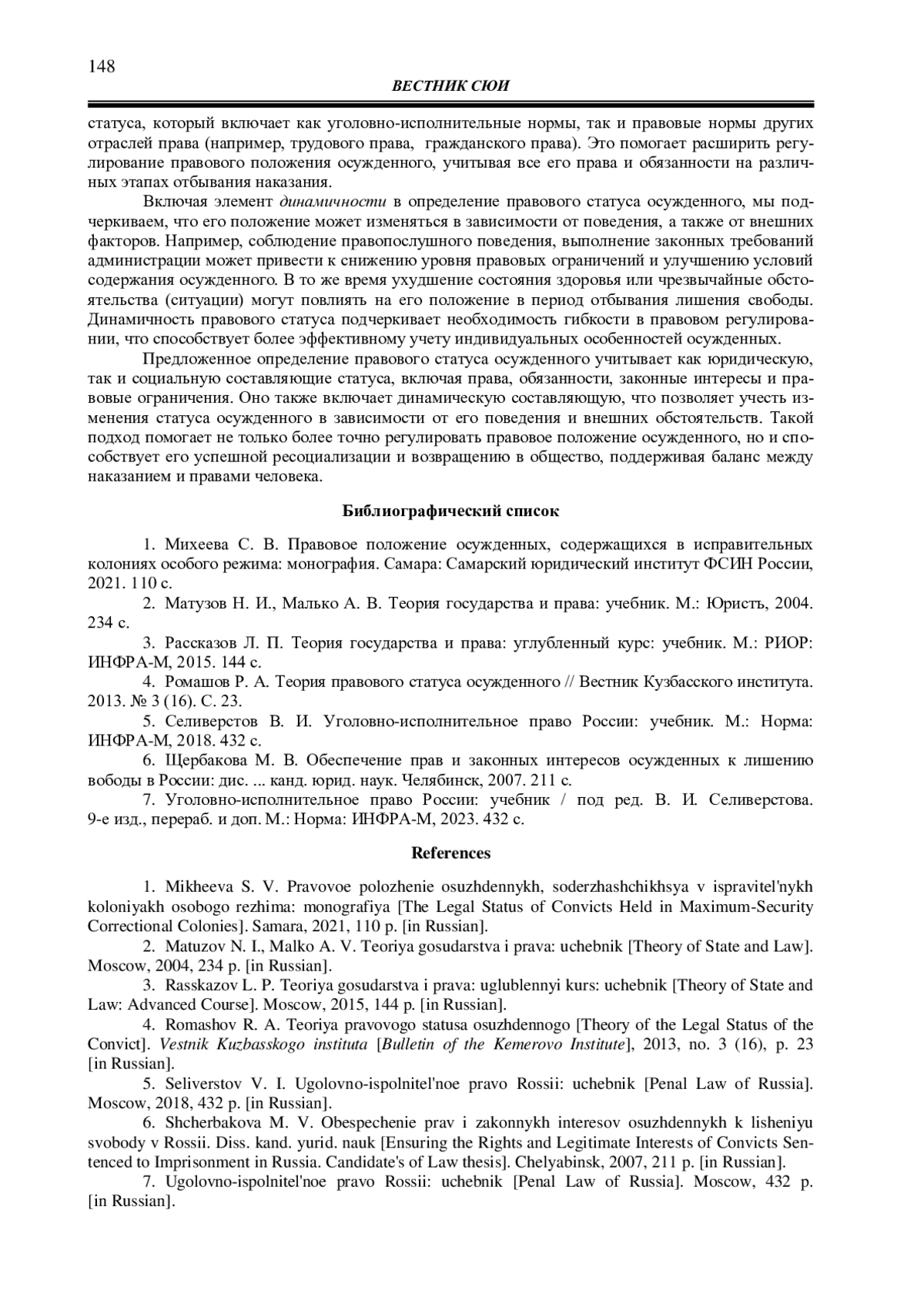 4. Ромашов Р. А. Теория правового статуса осужденного // Вестник Кузбасского института. 2013. № 3 (16). С. 23.