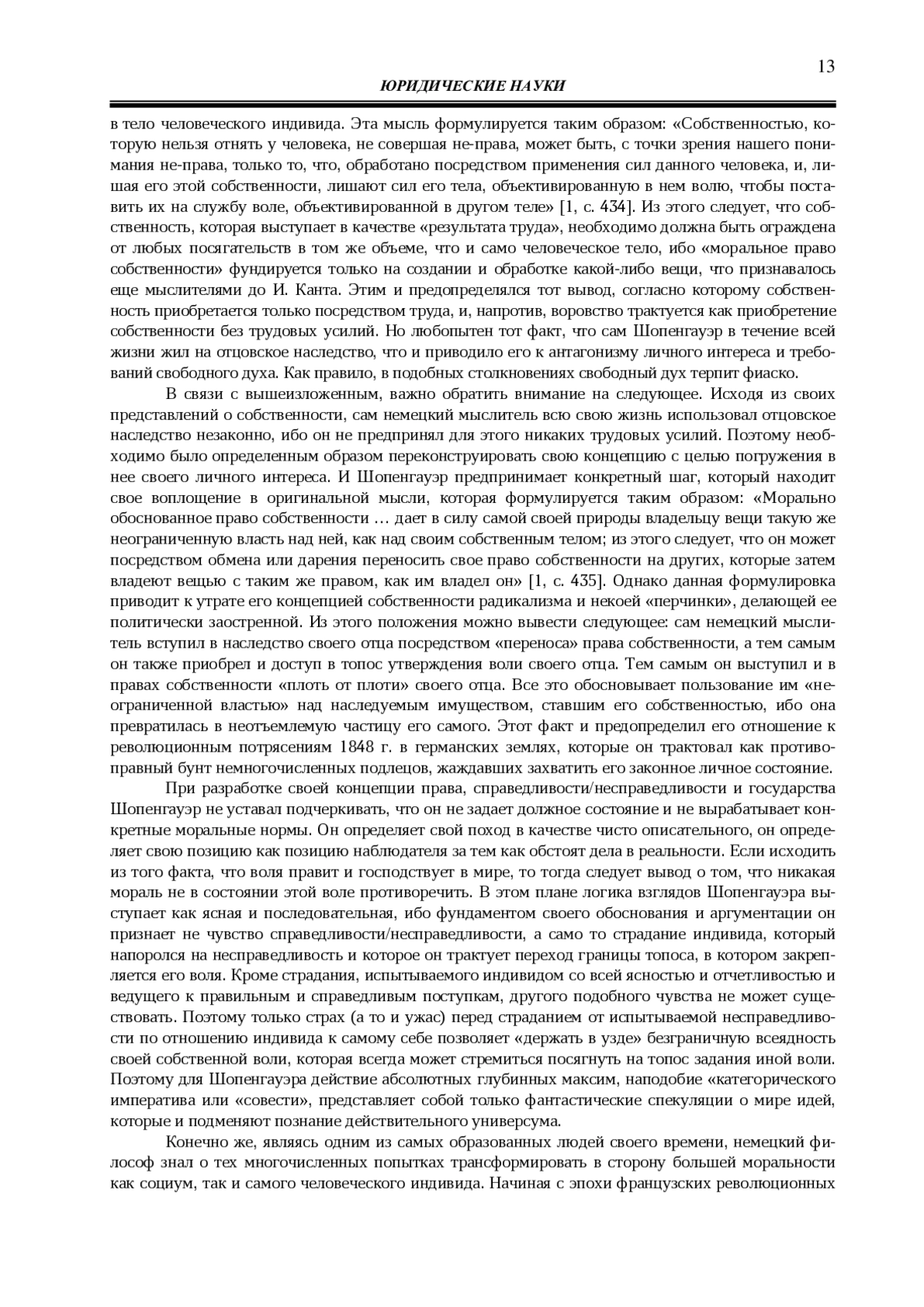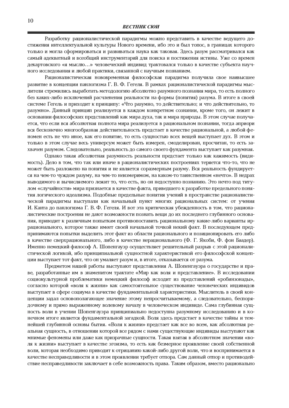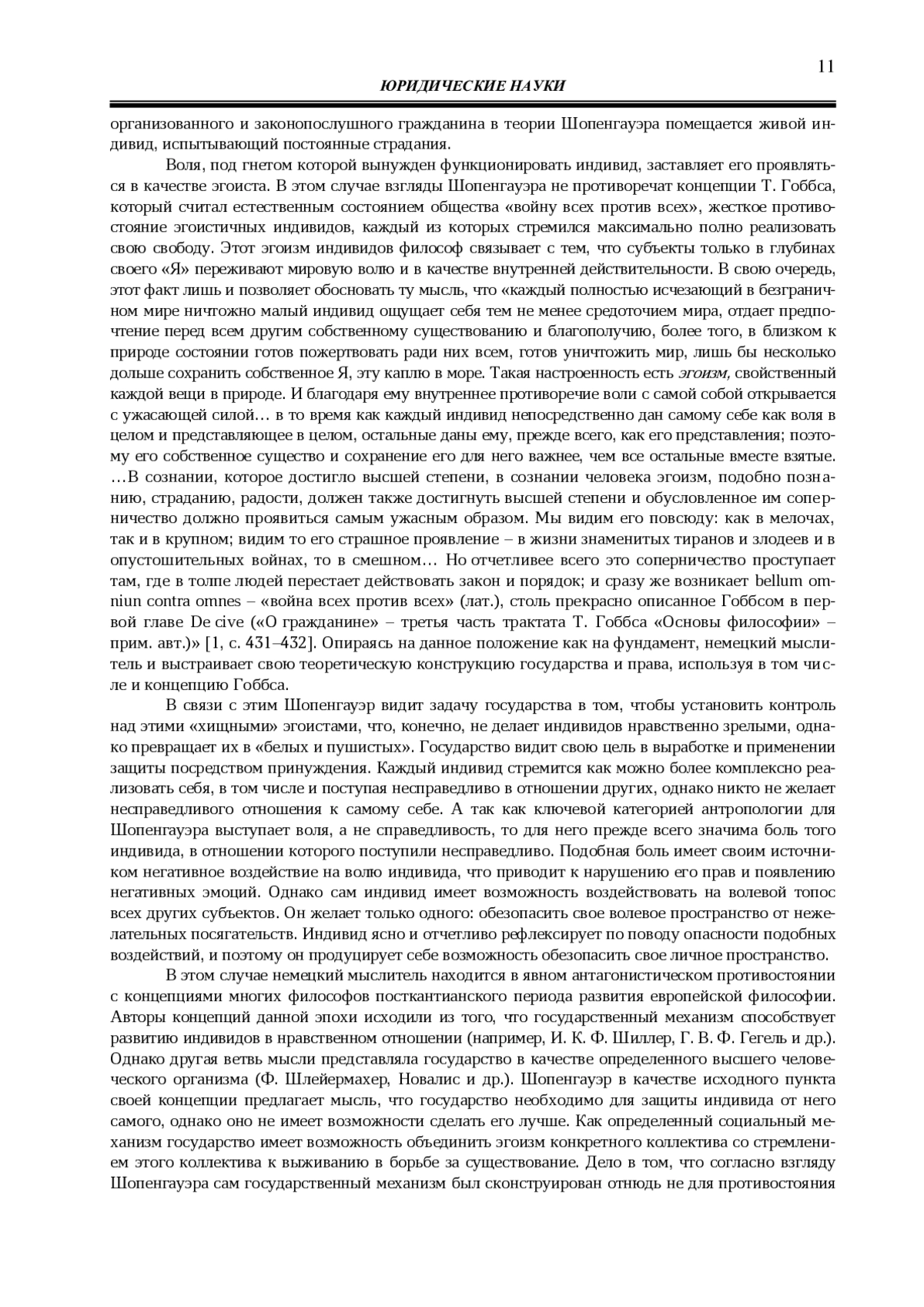 В статье рассматриваются идеи великого немецкого мыслителя А. Шопенгауэра, связанные с его взглядами на проблематику права, морали и государства, изложенные в его знаменитом философском трактате «Мир как воля и представление». В статье раскрывается, что причиной перехода философов в пространство иррационализма явился тот факт, что рационалистическая методология не позволила высветить смыслы всей философской системы до конца, ибо всегда оставался недоступный разуму уголок. Именно этот остаток и привел к поиску чего-то сверх- или нерационального, которое бы позволило эксплицировать эти предельные смыслы мира. Такое начало в виде воли Шопенгауэр и кладет в основание своих представлений о социокультурном мире. Сама возможность права коренится в необходимости противостояния в отношении эгоизма и откровенного произвола человеческих индивидов. Целью же формирования государственного механизма выступает объединение воль индивидов в борьбе за выживание в опасном мире. Автор подчеркивает, что роль государства и права сводится всего лишь к функции «необходимого зла». Именно в праве, государстве и морали Шопенгауэр видит абсолютную доминанту мирового начала - воли, ибо их задача состоит в недопущении еще большего зла в социальном мире.