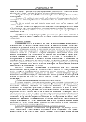 Объектом исследования являются правоотношения, возникающие при реализации права лиц, содержащихся под стражей, на юридическую помощь.