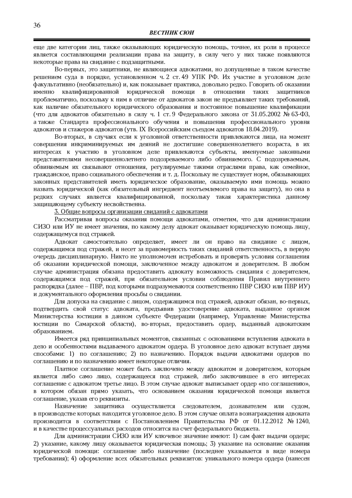 Коллизии порождаются как лакунами, так и противоречиями в правовом регулировании рассматриваемых правоотношений, а также систематически возникающими в процессе правоприменения конфликтными ситуациями, связанными, например, с отказом лица, содержащегося в следственном изоляторе или в исправительном учреждении, от свидания с адвокатом; с допуском на территорию пенитенциарного учреждения иных лиц, осуществляющих защиту по уголовным делам.