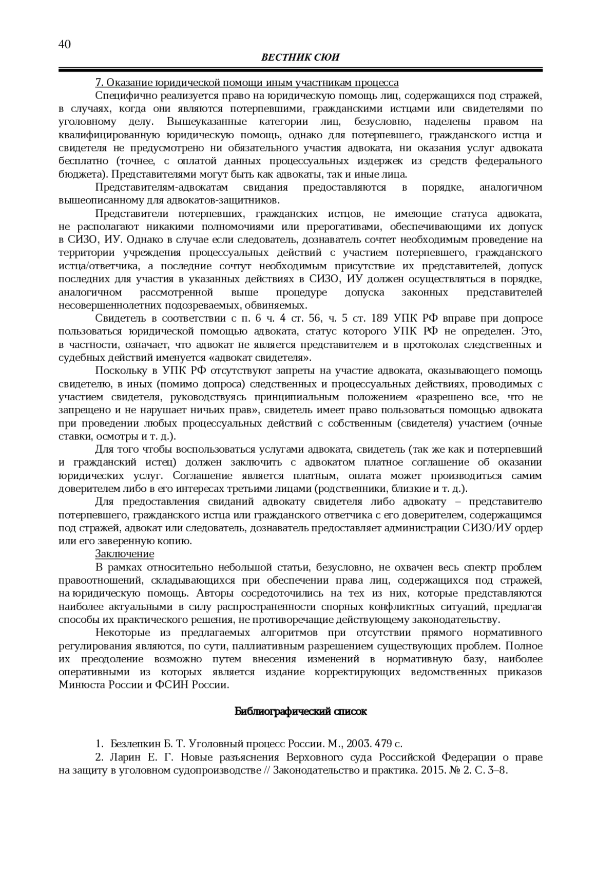 2. 	Ларин Е. Г. Новые разъяснения Верховного суда Российской Федерации о праве на защиту в уголовном судопроизводстве // Законодательство и практика. 2015. № 2. С. 3-8. EDN: VEGHNN
