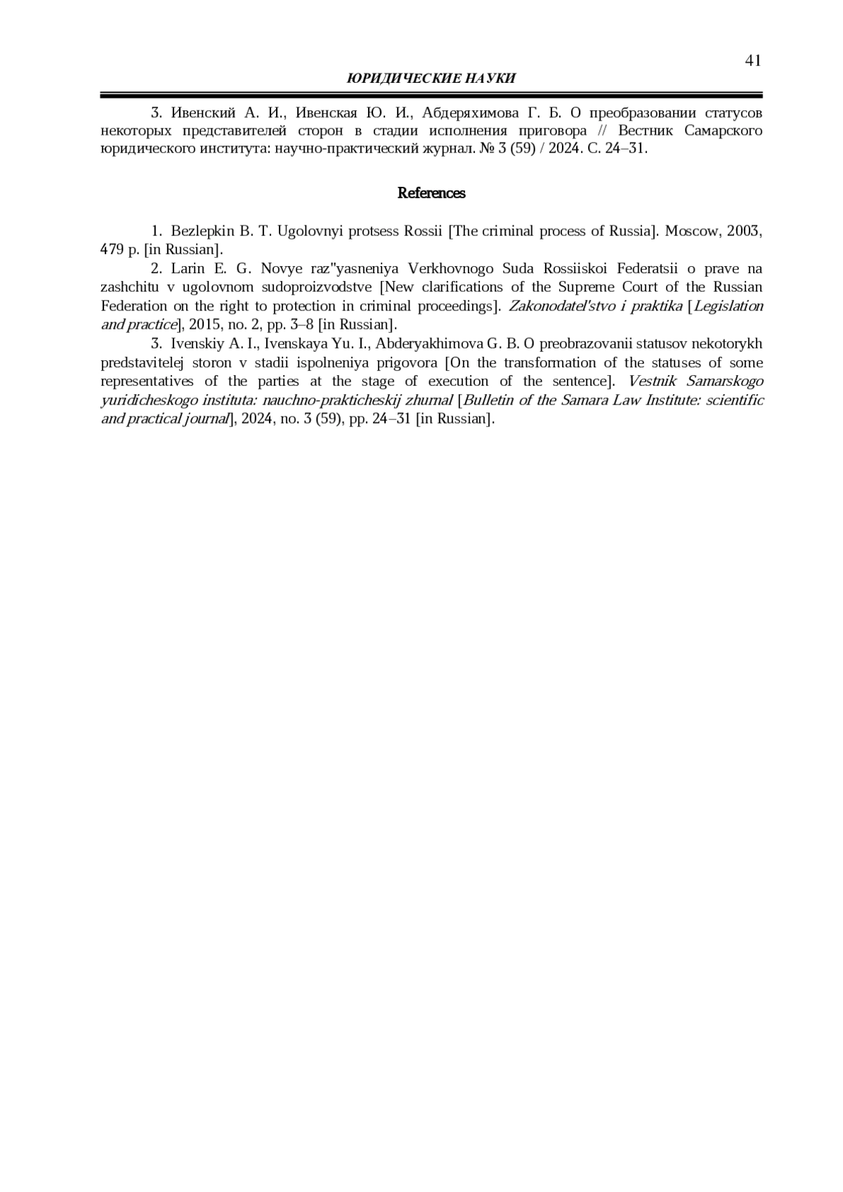 3. 	Ивенский А. И., Ивенская Ю. И., Абдеряхимова Г. Б. О преобразовании статусов некоторых представителей сторон в стадии исполнения приговора // Вестник Самарского юридического института: научно-практический журнал. № 3 (59) / 2024. С. 24-31.