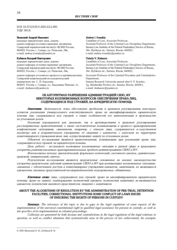Результатами исследования являются предлагаемые основанные на анализе законодательства алгоритмы практических действий администрации СИЗО и ИУ при возникающих коллизионных ситуациях, связанных с обеспечением доступа в пенитенциарные учреждения адвокатов, защитников, не являющихся адвокатами, законных представителей несовершеннолетних подозреваемых, обвиняемых.