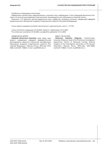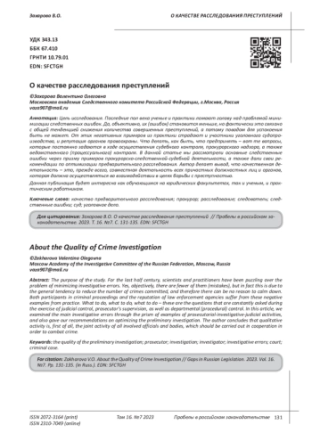 Zakharova V.O. On some requirements for the implementation of prosecutorial supervision of the preliminary investigation // Investigation of crimes: problems and ways to solve them. - 2017. - № 2(16). - Pp. 99-102.