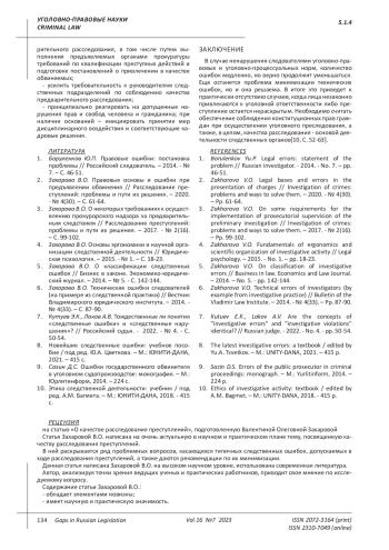 5. 	Захарова В.О. О классификации следственных ошибок // Бизнес в законе. Экономико-юридический журнал. - 2014. - № 5. - С. 142-144. EDN: TUUJQP
