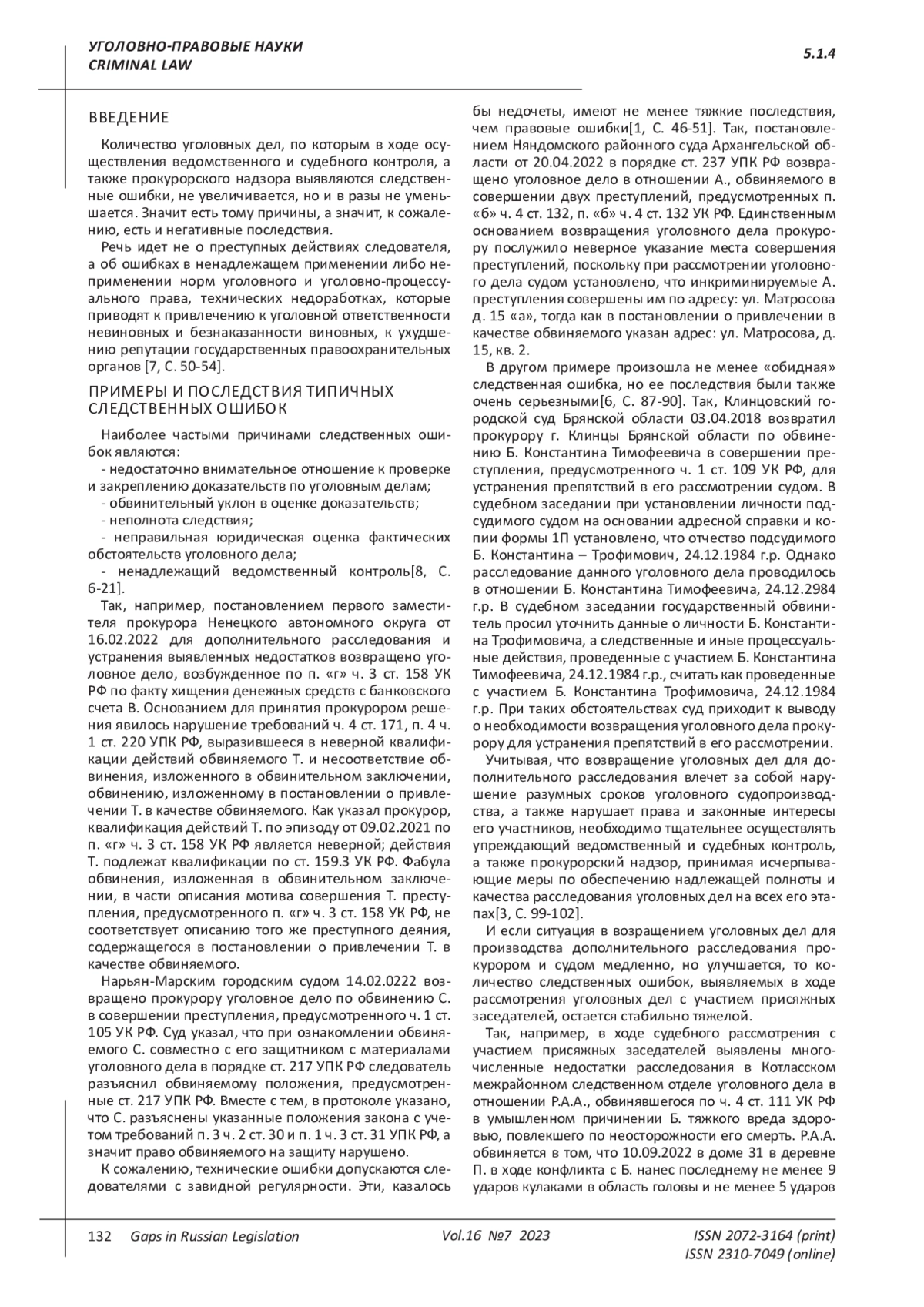 8. 	Новейшие следственные ошибки: учебное пособие / под ред. Ю.А. Цветкова. - М.: ЮНИТИ-ДАНА, 2021. - 415 с. EDN: RYDDAE