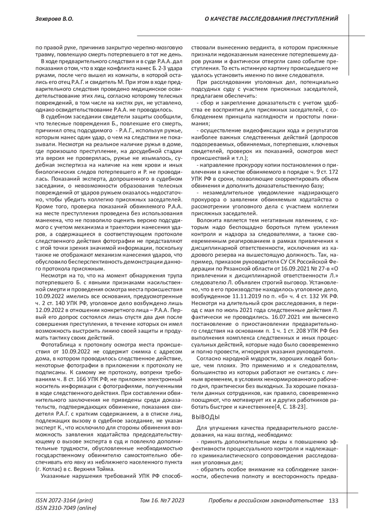 6. 	Захарова В.О. Технические ошибки следователей (на примере из следственной практики) // Вестник Владимирского юридического института. - 2014. - № 4(33). - С. 87-90. EDN: TFBJGT