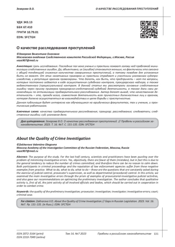 Zakharova V.O. On classification of investigative errors // Business in law. Economics and Law Journal. - 2014. - No. 5. - pp. 142-144. EDN: TUUJQP
