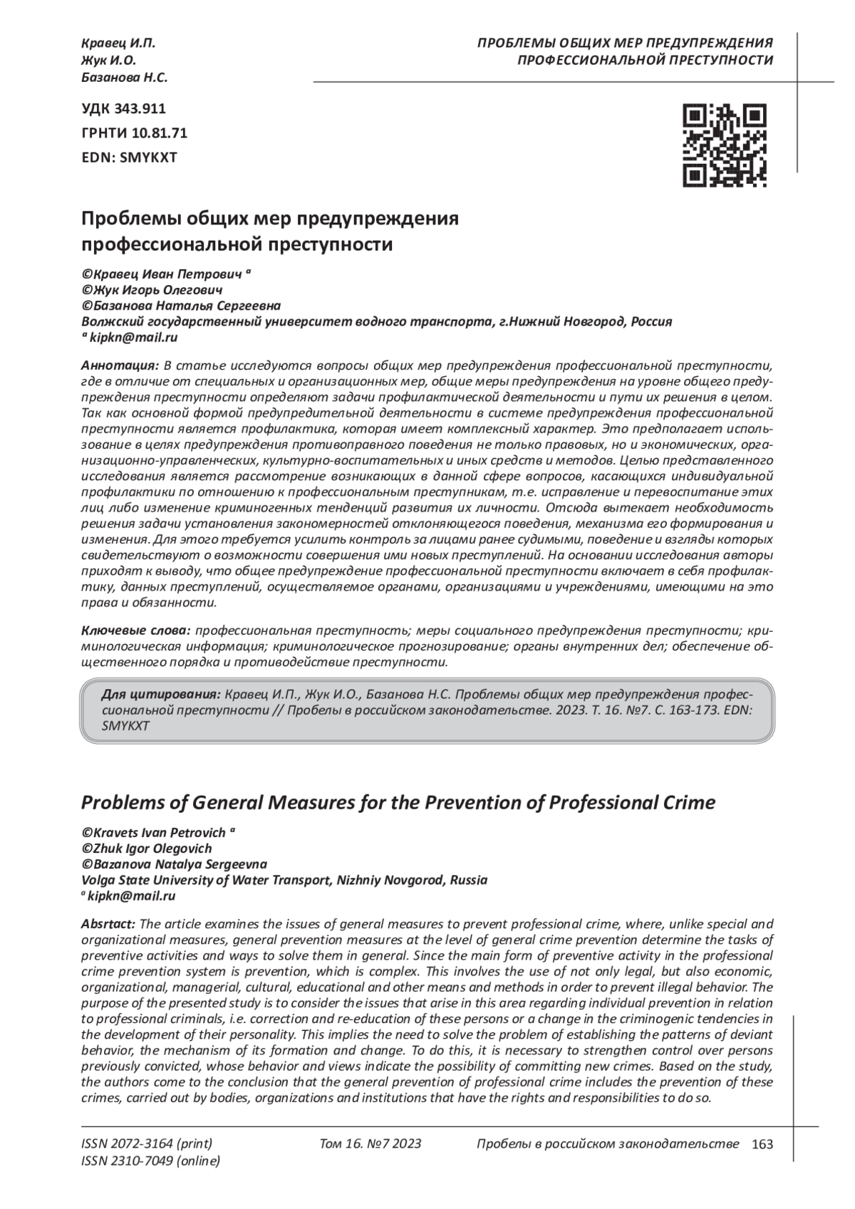 Kravets, I.P., (2022), Problems of special measures to prevent professional criminality. Gaps in Russian legislation. 2022. Vol.15. №2. P. 134-143. EDN: PZUKUF
