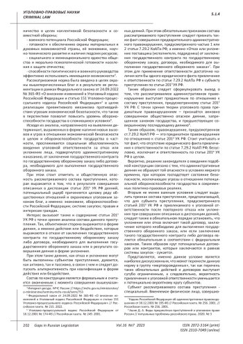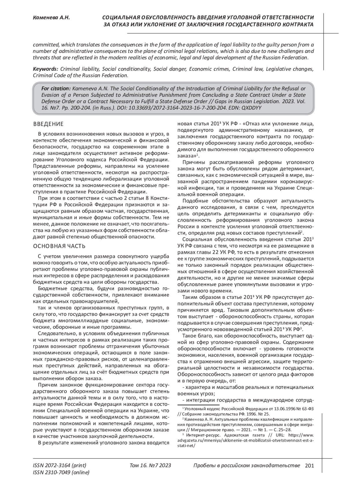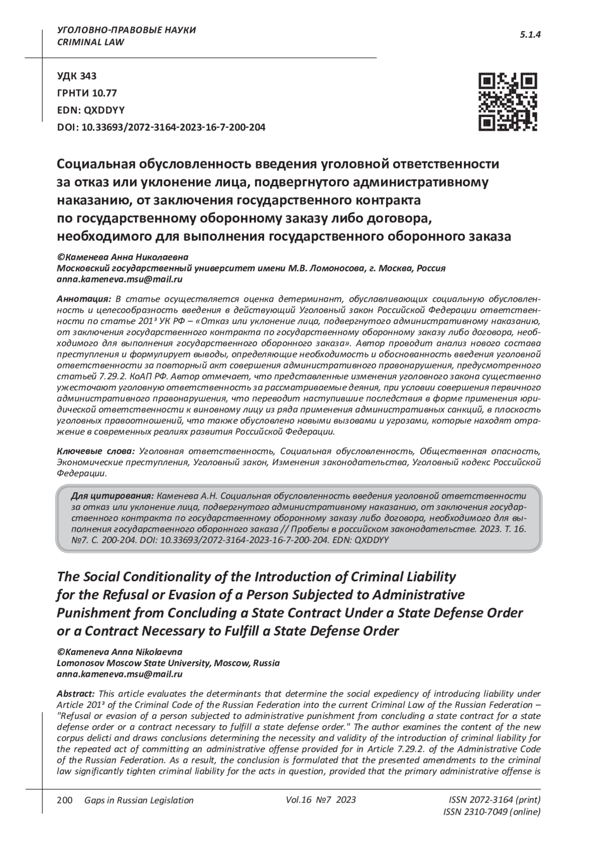 В статье осуществляется оценка детерминант, обуславливающих социальную обусловленность и целесообразность введения в действующий Уголовный закон Российской Федерации ответственности по статье 2013 УК РФ - «Отказ или уклонение лица, подвергнутого административному наказанию, от заключения государственного контракта по государственному оборонному заказу либо договора, необходимого для выполнения государственного оборонного заказа». Автор проводит анализ нового состава преступления и формулирует выводы, определяющие необходимость и обоснованность введения уголовной ответственности за повторный акт совершения административного правонарушения, предусмотренного статьей 7.29.2. КоАП РФ. Автор отмечает, что представленные изменения уголовного закона существенно ужесточают уголовную ответственность за рассматриваемые деяния, при условии совершения первичного административного правонарушения, что переводит наступившие последствия в форме применения юридической ответственности к виновному лицу из ряда применения административных санкций, в плоскость уголовных правоотношений, что также обусловлено новыми вызовами и угрозами, которые находят отражение в современных реалиях развития Российской Федерации.