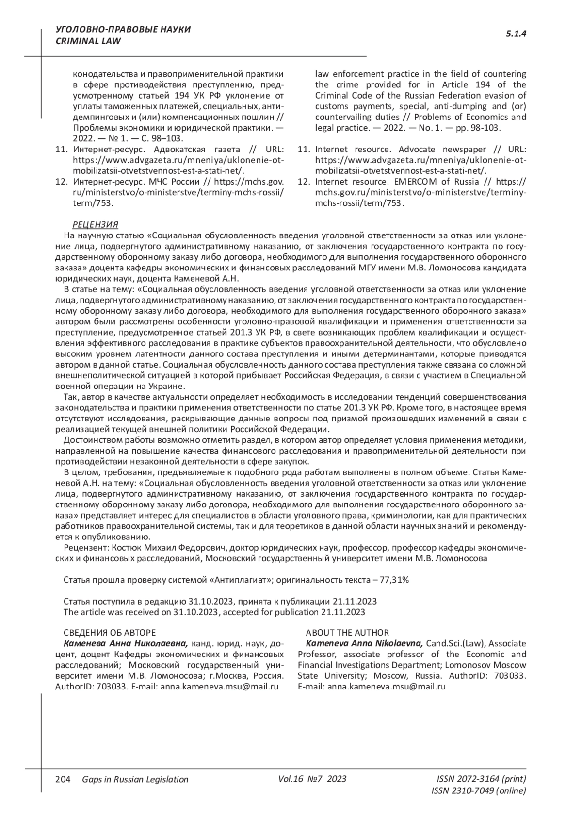 10. 	Каменева А. Н. Тенденции совершенствования законодательства и правоприменительной практики в сфере противодействия преступлению, предусмотренному статьей 194 УК РФ уклонение от уплаты таможенных платежей, специальных, антидемпинговых и (или) компенсационных пошлин // Проблемы экономики и юридической практики. - 2022. - № 1. - С. 98-103. EDN: BKRJQN