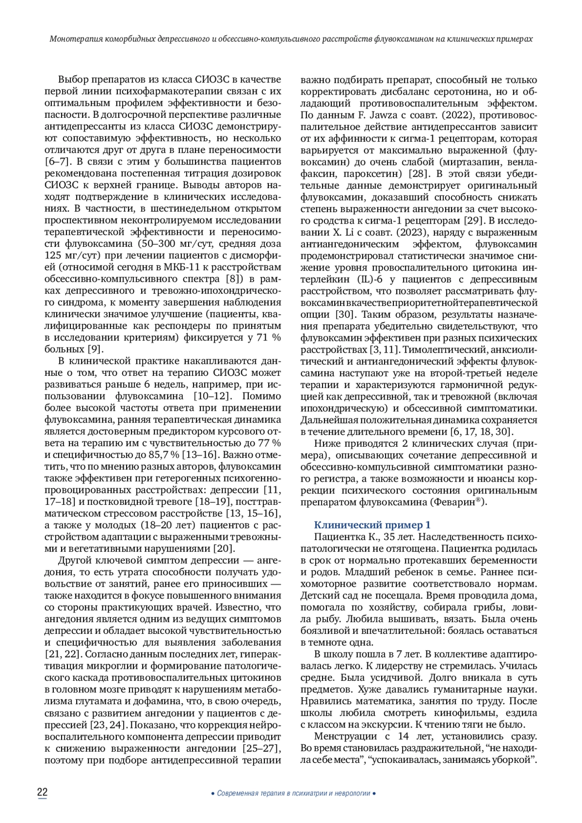 18. 	Морозов П.В. Флувоксамин включен в российские временные рекомендации терапии СOVID-19 и другие аналогичные протоколы в ряде стран (краткий обзор новейших данных). Психиатрия и психофармакотерапия. 2022; 1: 49-50.