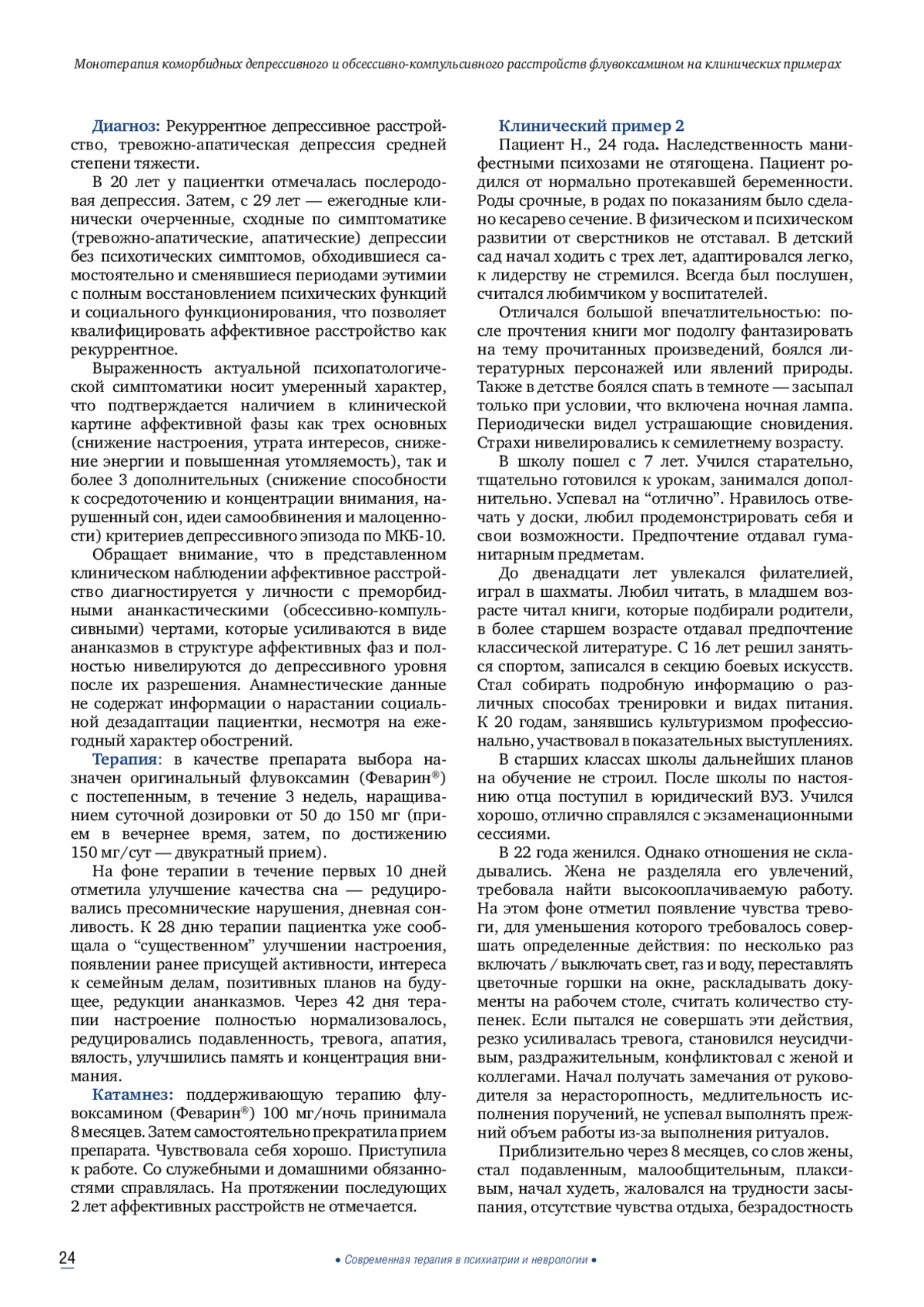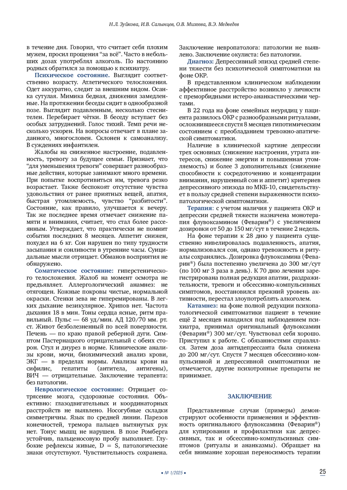 12. 	Медведев В.Э. Флувоксамин (Феварин) в терапии расстройств обсессивно-компульсивного спектра. // Журнал психиатрии и психофармакотерапии. - 2015.-№1. - с.44-49.