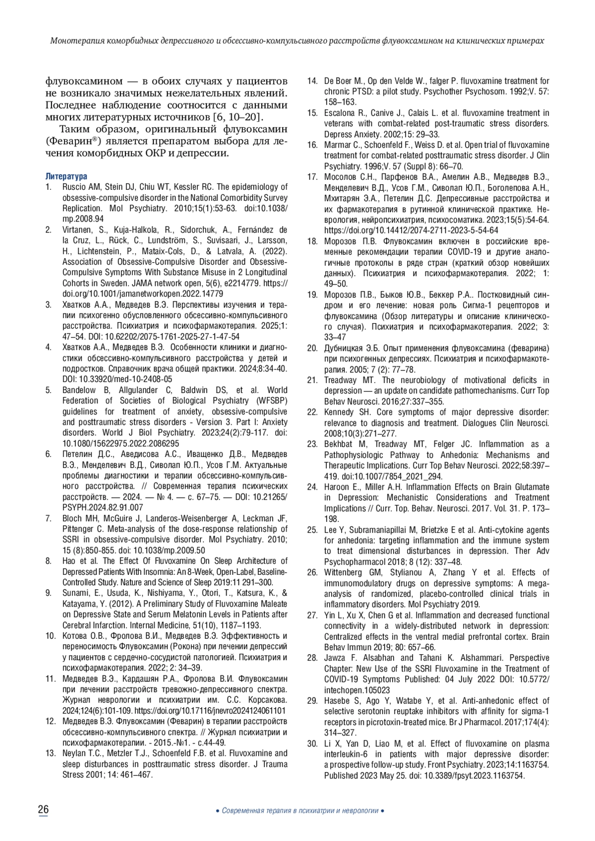 11. 	Медведев В.Э., Кардашян Р.А., Фролова В.И. Флувоксамин при лечении расстройств тревожно-депрессивного спектра. Журнал неврологии и психиатрии им. С.С. Корсакова. 2024;124(6):101-109. DOI: 10.17116/jnevro2024124061101