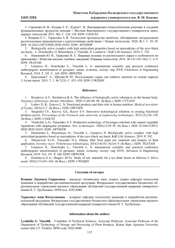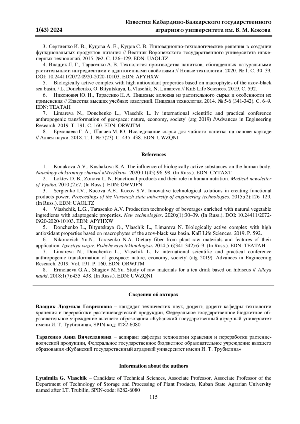 4. 	Влащик Л. Г., Тарасенко А. В. Технология производства напитков, обогащенных натуральными растительными ингредиентами с адаптогенными свойствами // Новые технологии. 2020. № 1. С. 30-39. DOI: 10.24411/2072-0920-2020-10103 EDN: APYHXW