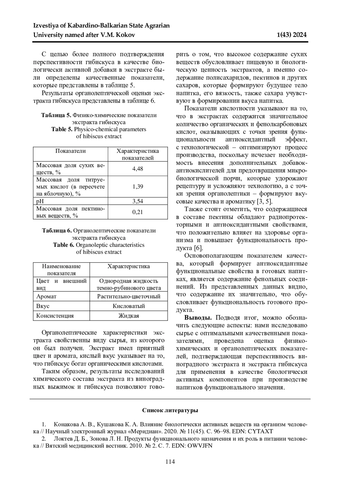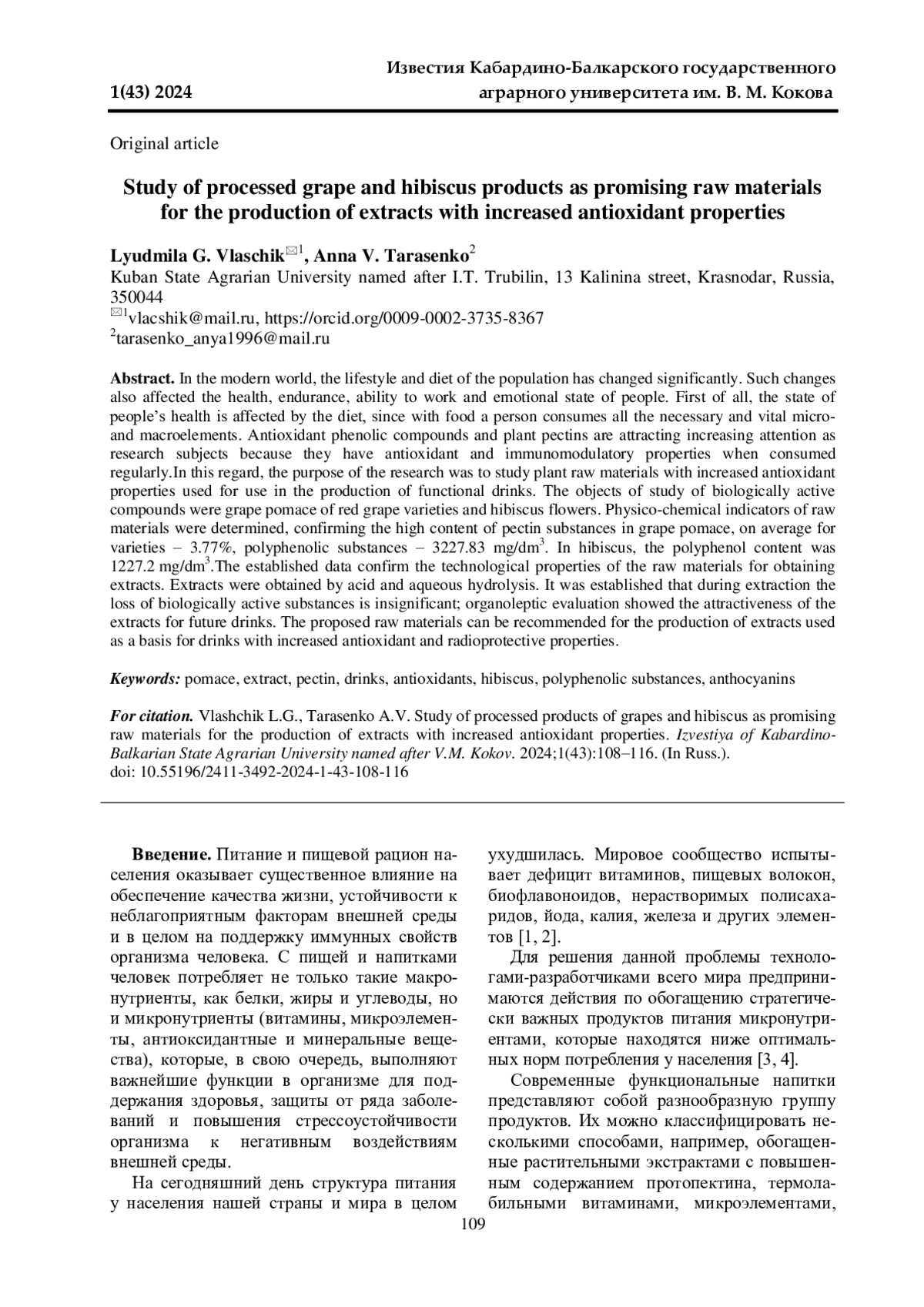 В современном мире образ жизни и рацион населения в значительной степени изменился. Такие изменения повлияли и на здоровье, выносливость, трудоспособность и эмоциональное состояние людей. В первую очередь на состояние здоровья людей влияет пищевой рацион, поскольку с пищей человек потребляет все необходимые и жизненно важные микро- и макроэлементы. Антиоксидантные фенольные соединения и пектиновые вещества растений привлекают все больше внимания в качестве объекта исследования, так как они обладают антиоксидантными и иммуномодулирующими свойствами при регулярном употреблении. В связи с этим целью исследований явилось изучение растительного сырья с повышенными антиоксидантными свойствами, используемого для применения в производстве функциональных напитков. Объекты изучения биологически активных соединений - виноградные выжимки красных сортов винограда и цветки гибискуса. Определены физико-химические показатели сырья, подтверждающие высокое содержание пектиновых веществ в виноградных выжимках, в среднем по сортам - 3,77%, полифенольных веществ - 3227,83 мг/дм3. У гибискуса содержание полифенолов составило 1227,2 мг/дм3. Установленные данные подтверждают технологические свойства сырья для получения экстрактов. Экстракты получали методом кислотного и водного гидролиза. Установлено, что при экстракции потери биологически активных веществ незначительны, органолептическая оценка показала привлекательность экстрактов для будущих напитков. Предложенное сырье можно рекомендовать для производства экстрактов, используемых в качестве основы для напитков с повышенными антиоксидантными и радиопротекторными свойствами.