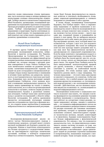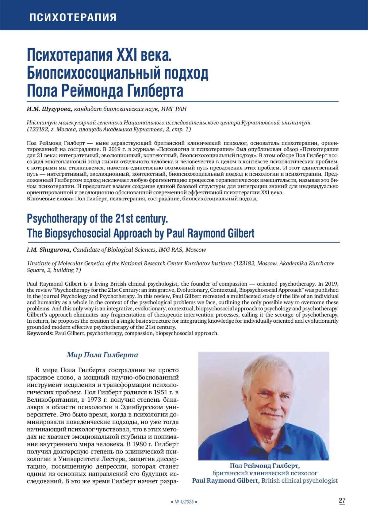 Пол Реймонд Гилберт — ныне здравствующий британский клинический психолог, основатель психотерапии, ориентированной на сострадание. В 2019 г. в журнале «Психология и психотерапия» был опубликован обзор «Психотерапия для 21 века: интегративный, эволюционный, контекстный, биопсихосоциальный подход». В этом обзоре Пол Гилберт воссоздал многоплановый этюд жизни отдельного человека и человечества в целом в контексте психологических проблем, с которыми мы сталкиваемся, наметив единственно возможный путь преодоления этих проблем. И этот единственный путь — интегративный, эволюционный, контекстный, биопсихосоциальный подход к психологии и психотерапии. Предложенный Гилбертом подход исключает любую фрагментацию процессов терапевтических вмешательств, называя это бичом психотерапии. И предлагает взамен создание единой базовой структуры для интеграции знаний для индивидуально ориентированной и эволюционно обоснованной современной эффективной психотерапии XXI века.