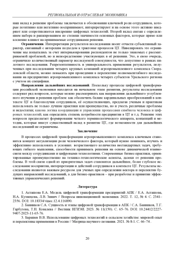 1. 	Асташова Е.А. Модель цифровой трансформации предприятий АПК / Е.А. Асташова, Н.А. Кузнецова, Л.В. Зинич // Вопросы инновационной экономики. 2022. Т. 12, № 4. С. 2341-2356.  DOI: 10.18334/vinec.12.4.116890  EDN: NVSISE