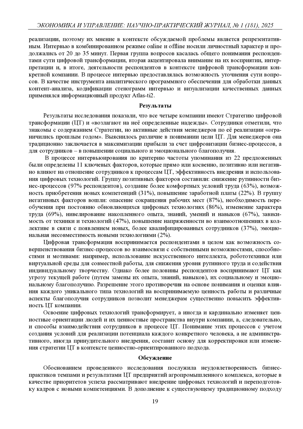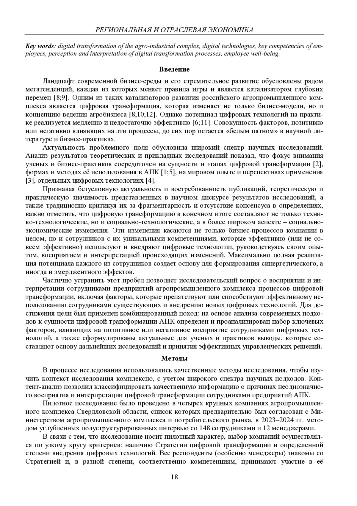 В статье анализируется роль человеческого фактора в процессе внедрения цифровых технологий на предприятиях российского агропромышленного комплекса. Представлены результаты пилотного исследования основных детерминант, которые негативно или позитивно влияют на отношения сотрудников к внедрению цифровых технологий. Доказана значимость оценки их восприятия и интерпретации процессов цифровой трансформации как ключевого условия эффективности происходящих изменений