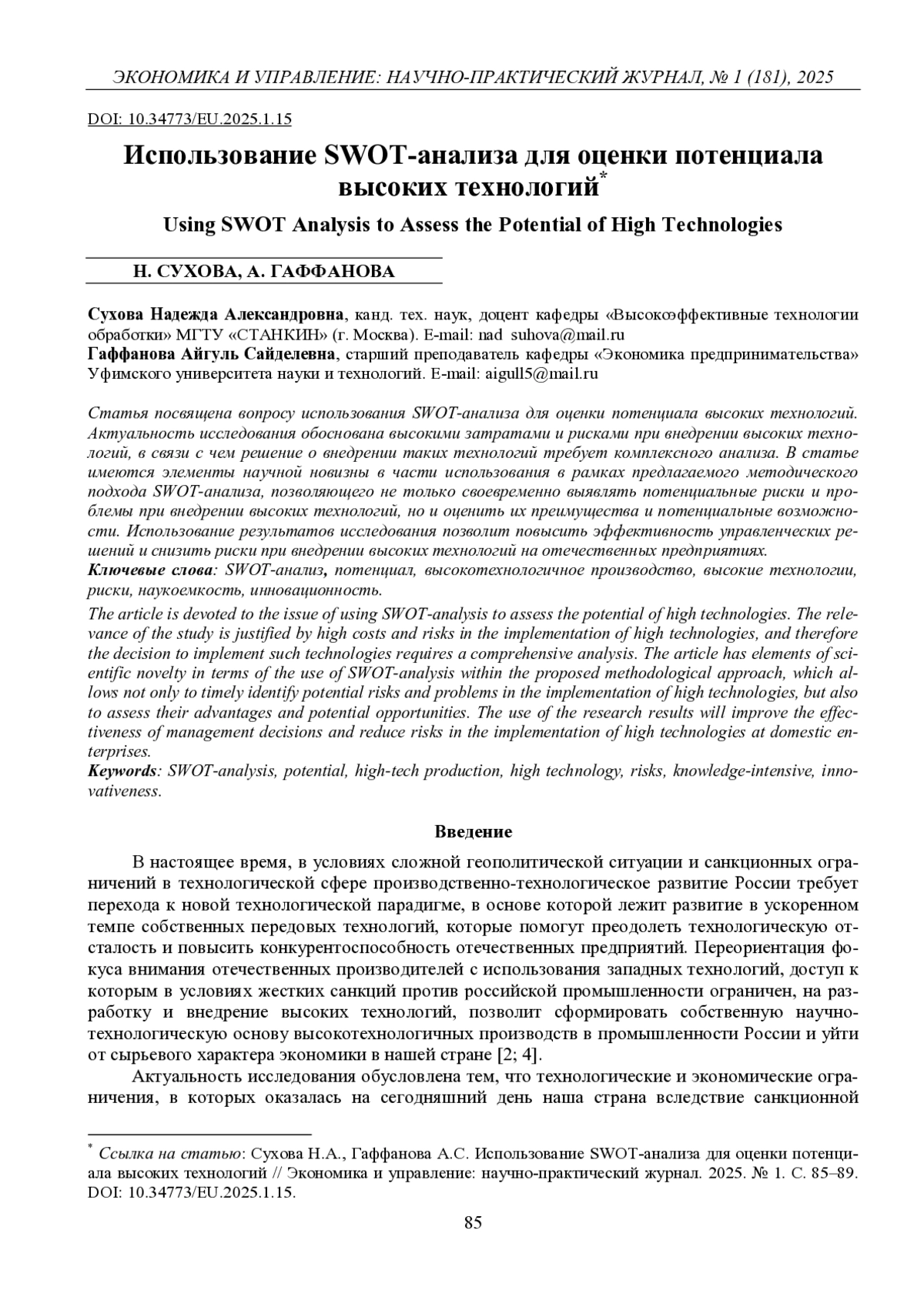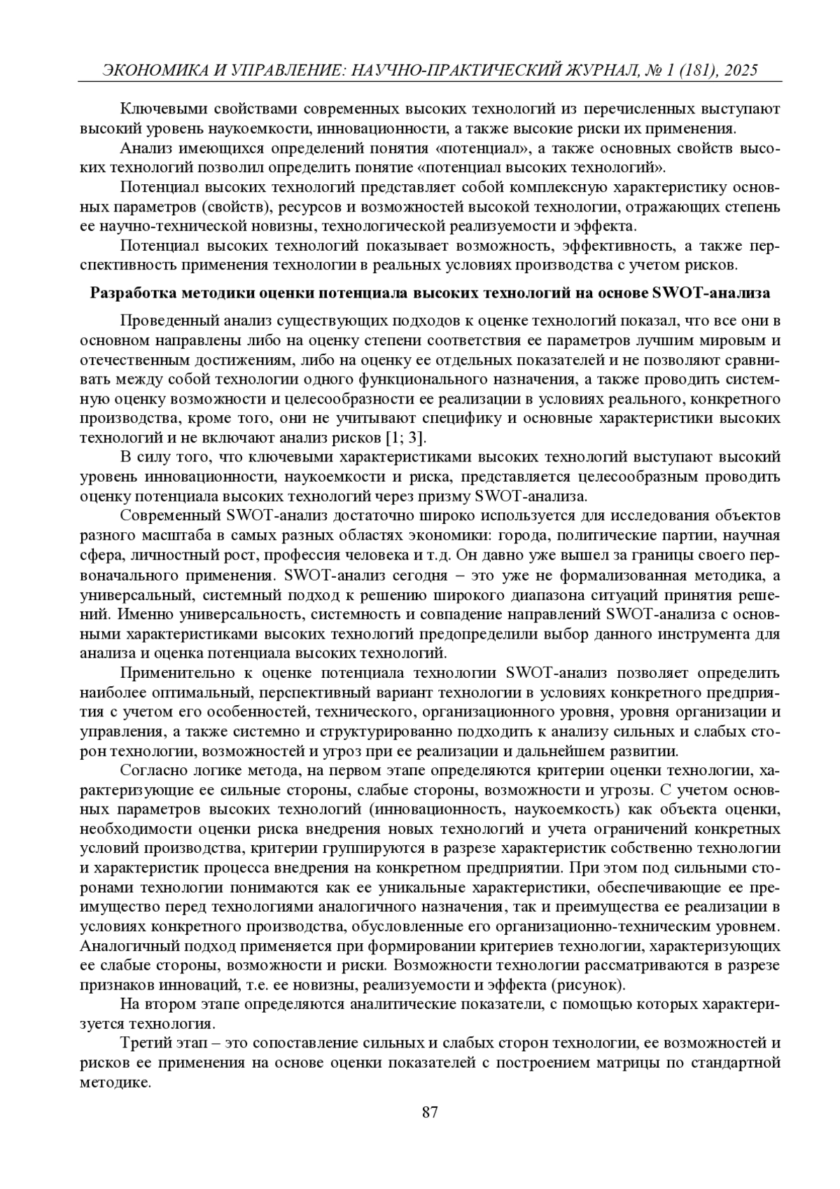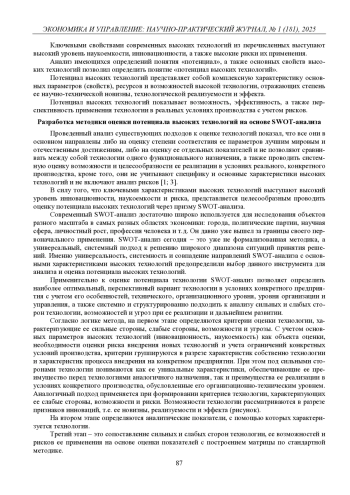 Статья посвящена вопросу использования SWOT-анализа для оценки потенциала высоких технологий. Актуальность исследования обоснована высокими затратами и рисками при внедрении высоких технологий, в связи с чем решение о внедрении таких технологий требует комплексного анализа. В статье имеются элементы научной новизны в части использования в рамках предлагаемого методического подхода SWOT-анализа, позволяющего не только своевременно выявлять потенциальные риски и проблемы при внедрении высоких технологий, но и оценить их преимущества и потенциальные возможности. Использование результатов исследования позволит повысить эффективность управленческих решений и снизить риски при внедрении высоких технологий на отечественных предприятиях