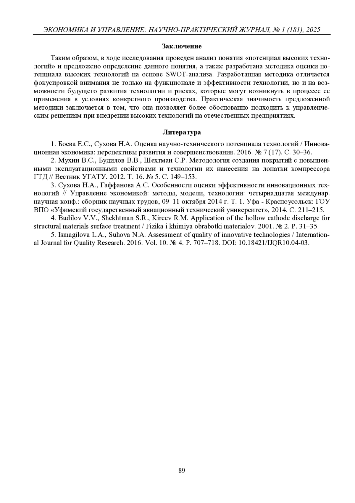 5. Ismagilova L.A., Suhova N.A. Assessment of quality of innovative technologies / International Journal for Quality Research. 2016. Vol. 10. № 4. P. 707-718. DOI: 10.18421/IJQR10.04-03 EDN: YUXYHV